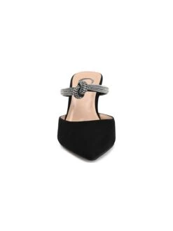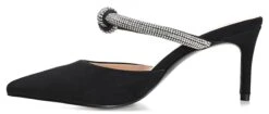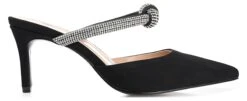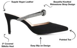 - Vegan leather upper in a backless pump style with an almond toe