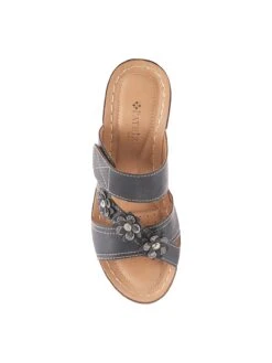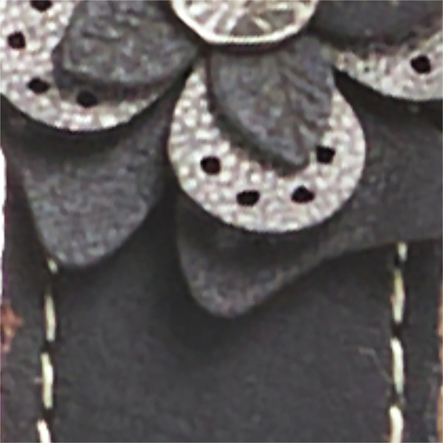 - Upper is enhanced by an asymmetrical strap with flower appliques