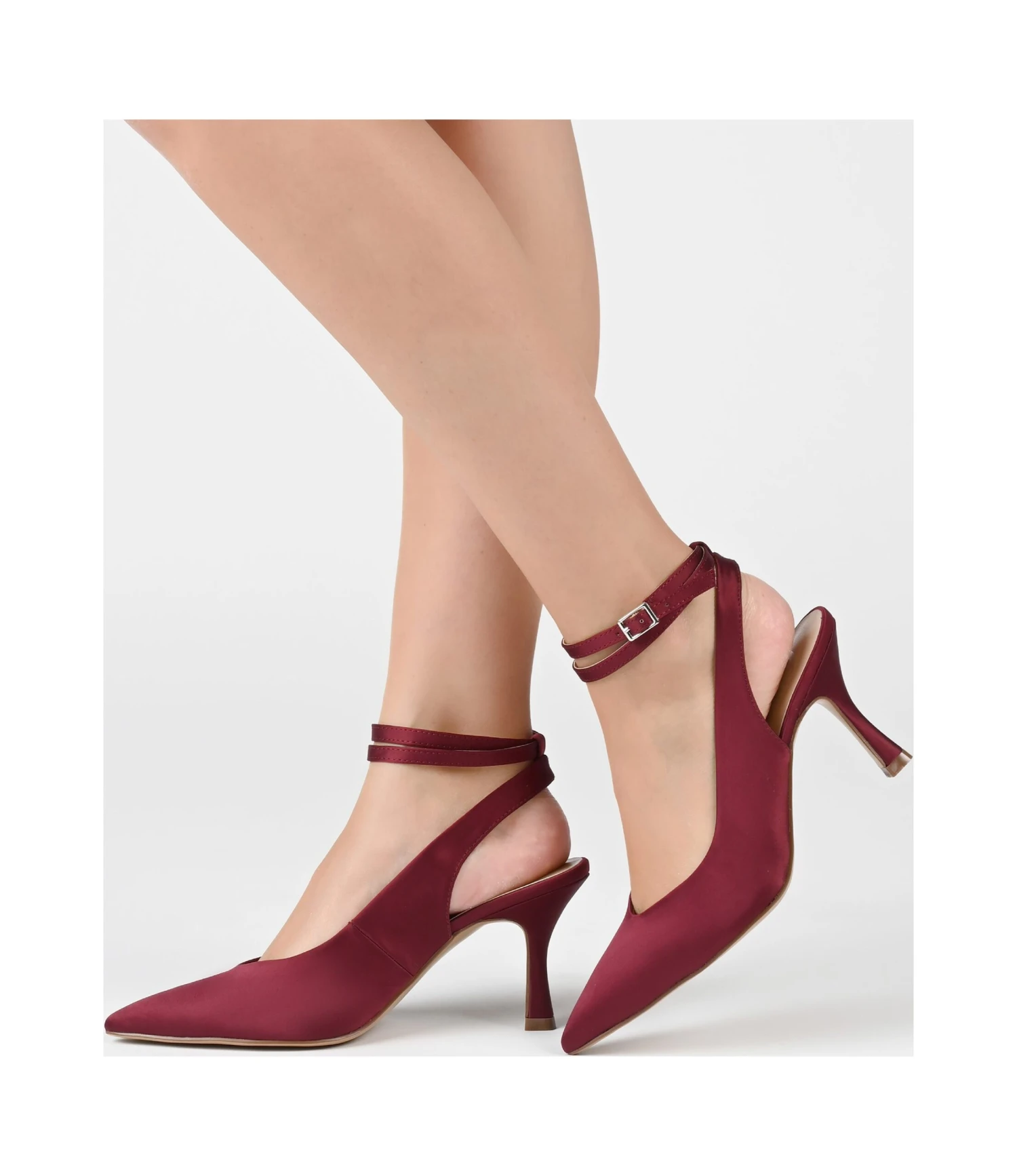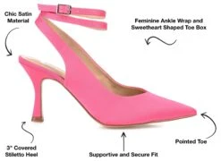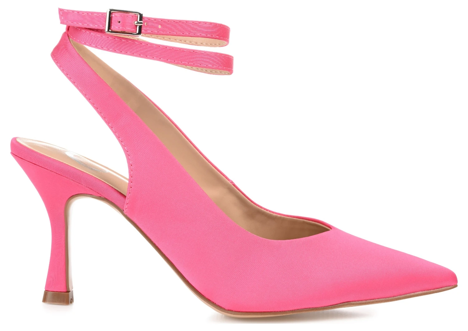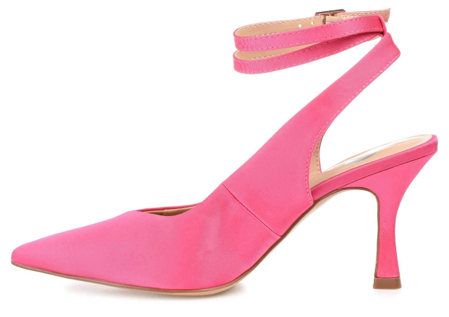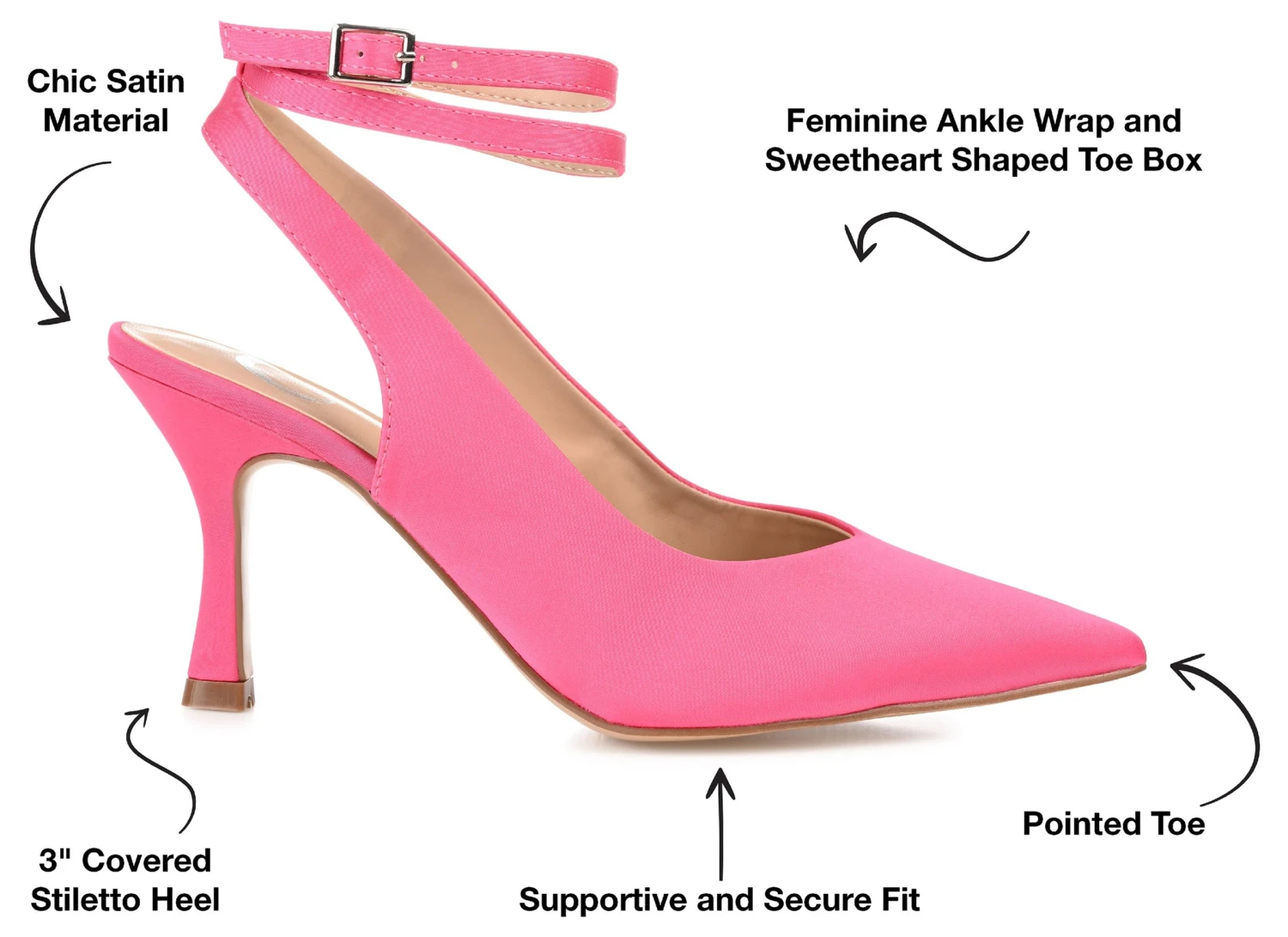 Our chicest heel yet, the Women’s Marcella Wide Pump by Journee Collection. With satin fabric uppers and a wrap-around buckle strap, this gorgeous heel is perfect for your next night out. A pointed-toe and sweetheart topline finish this backless silhouette for a retro look.
