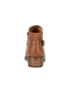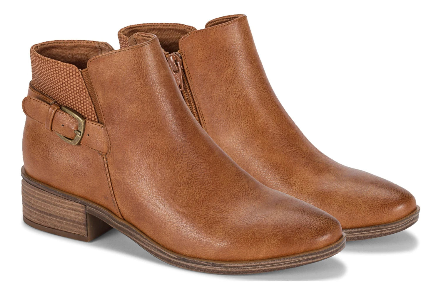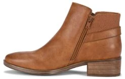 - Synthetic leather upper in a block heel ankle boot style with an almond toe