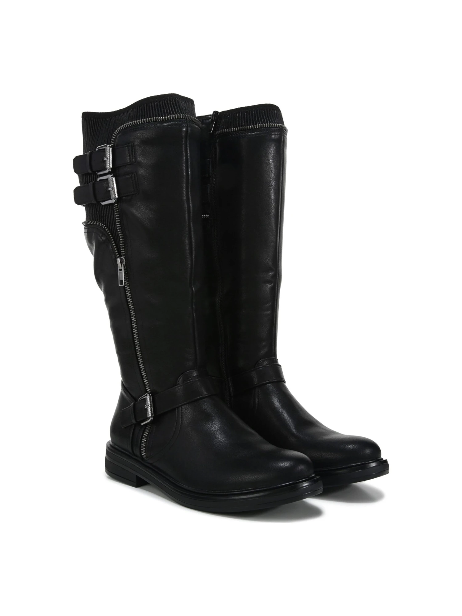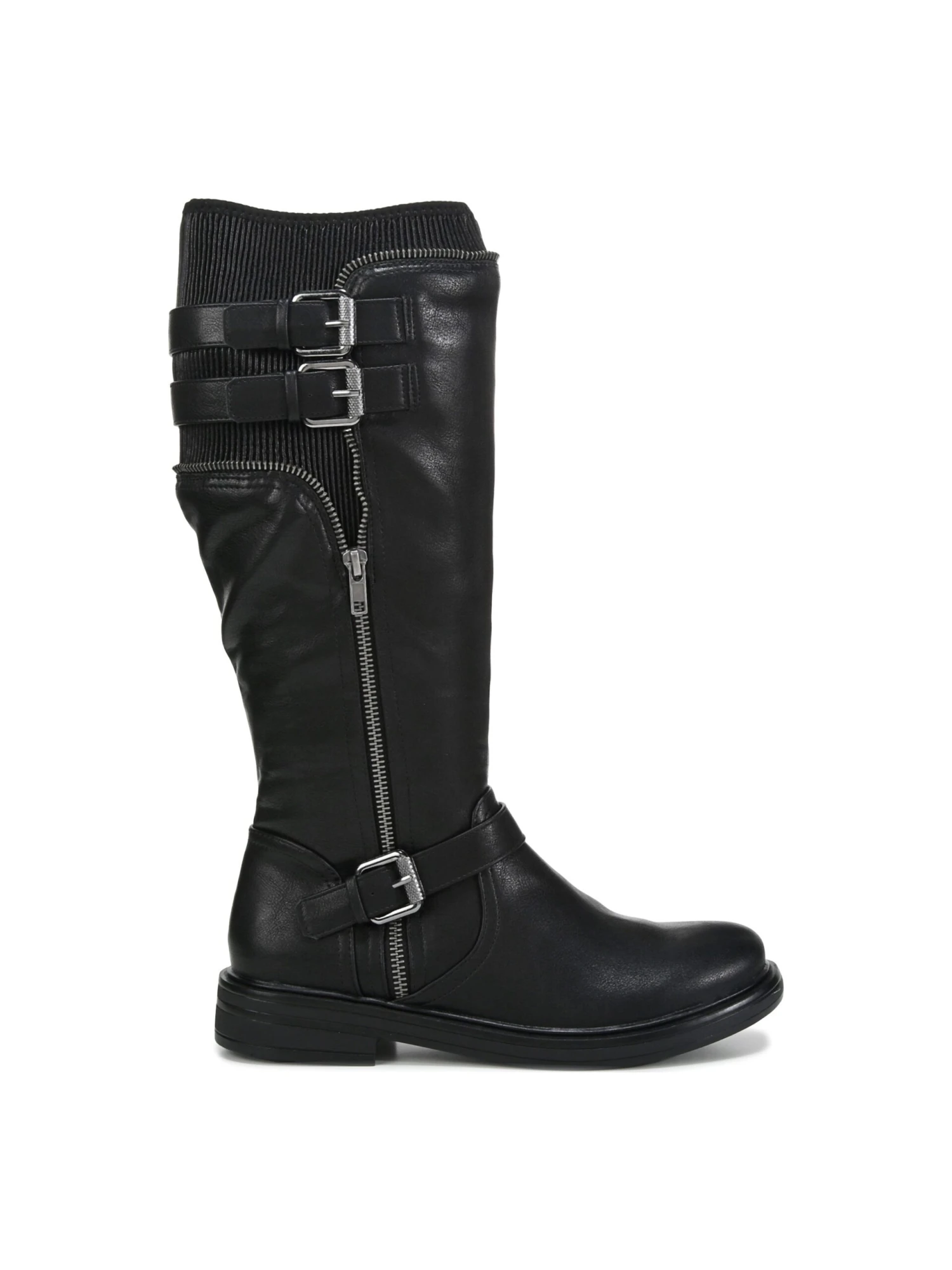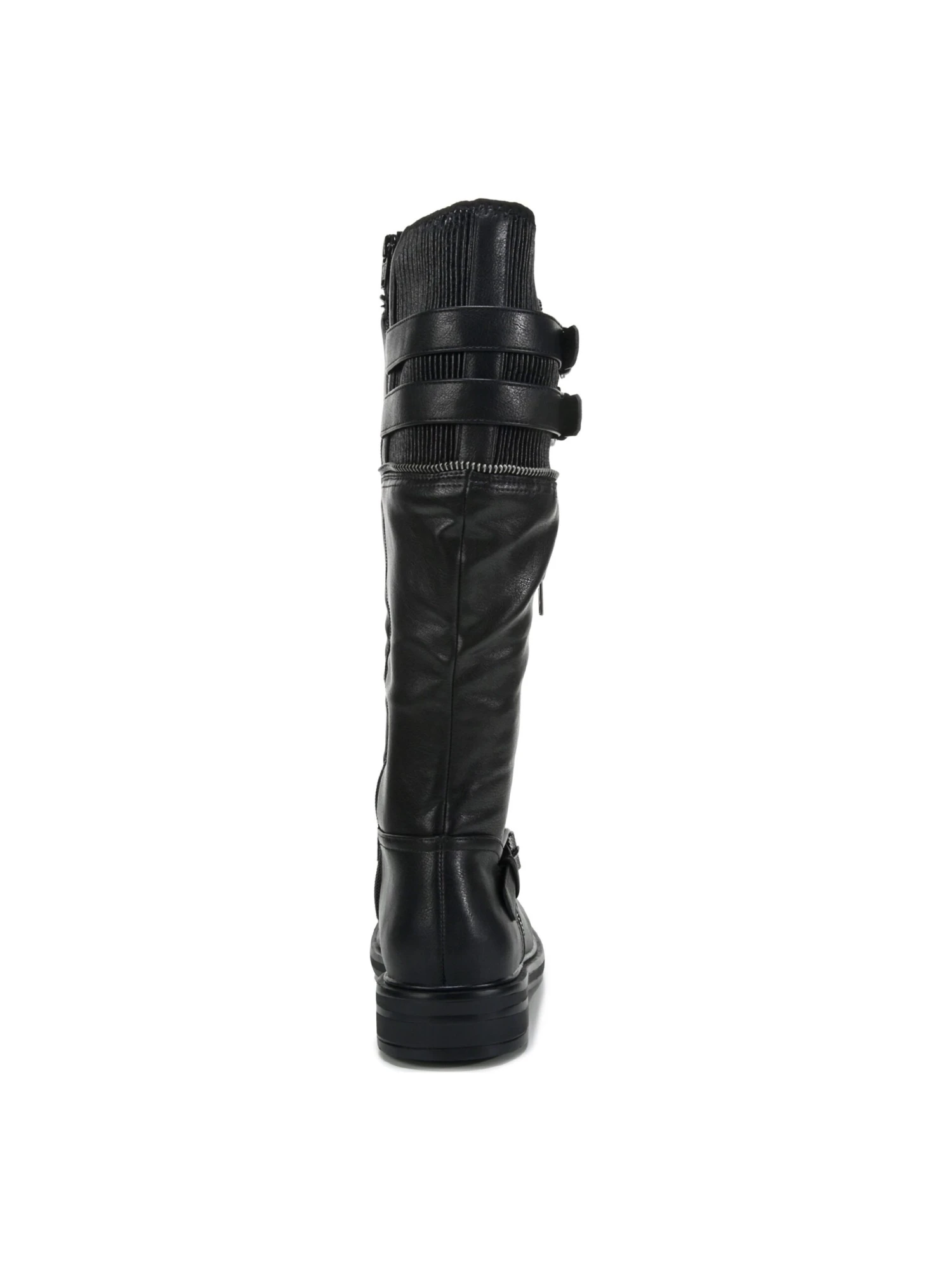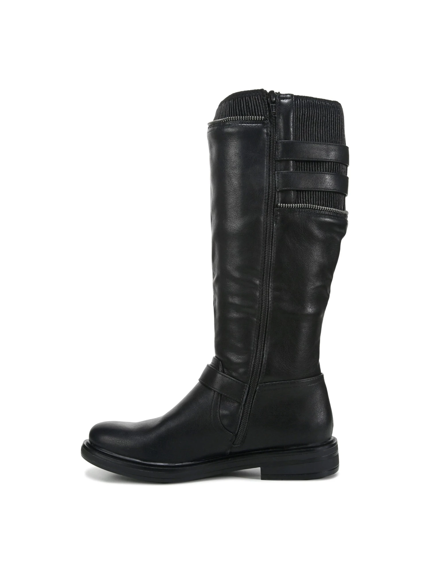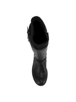 - Faux leather upper in a riding boot style with a round toe