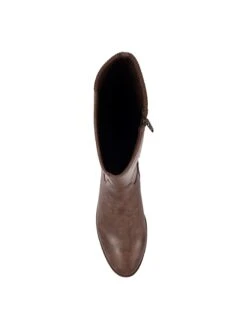 - Synthetic leather upper in a tall riding boot style with an almond toe