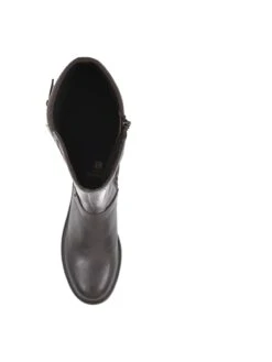 - Faux-leather upper in a riding boot style with a round toe