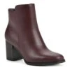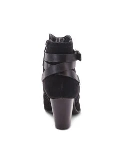 - Nubuck leather upper in a block-heel ankle boot style with a round toe