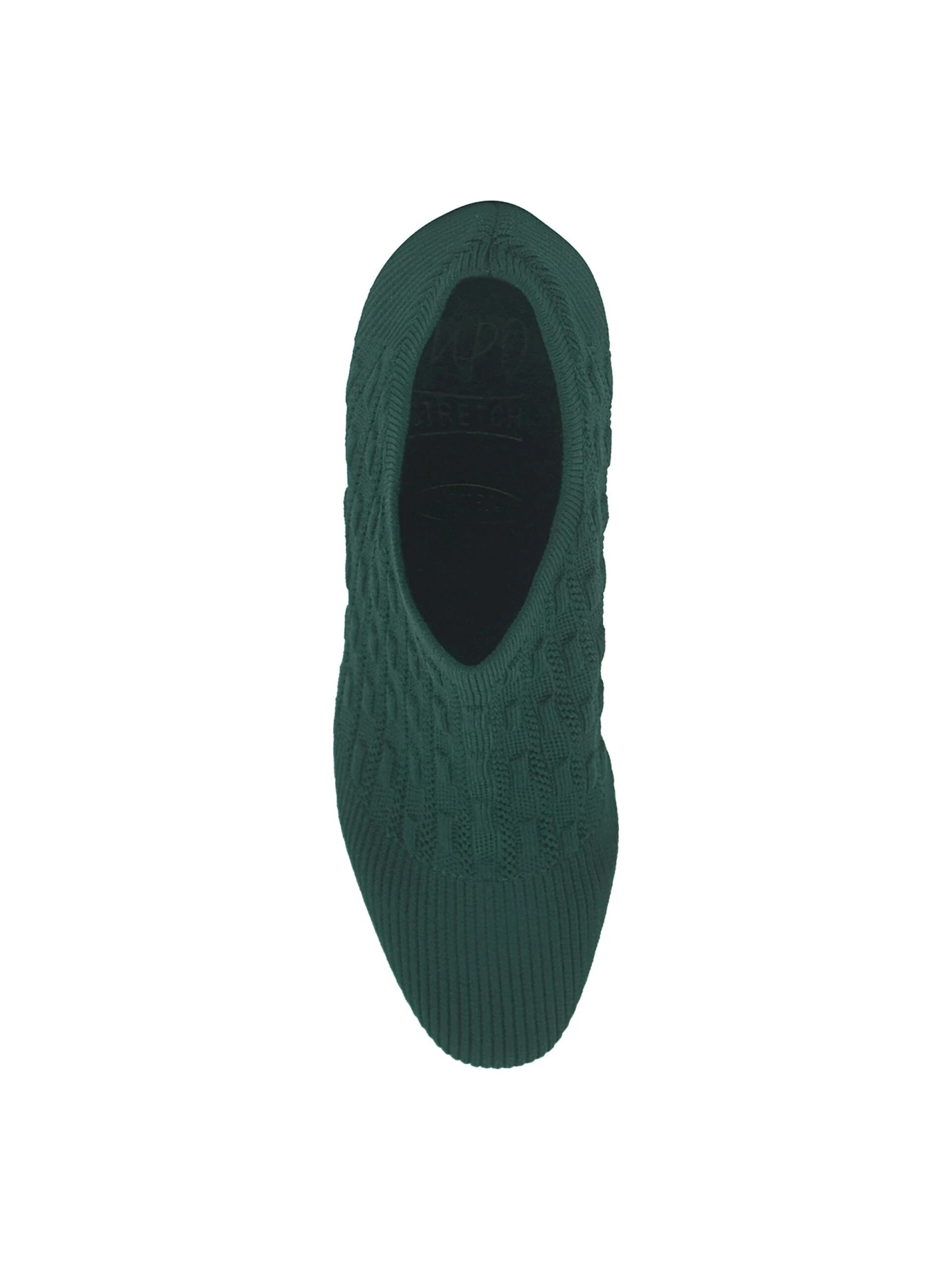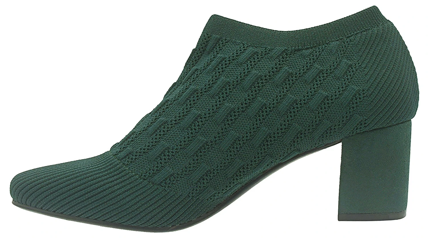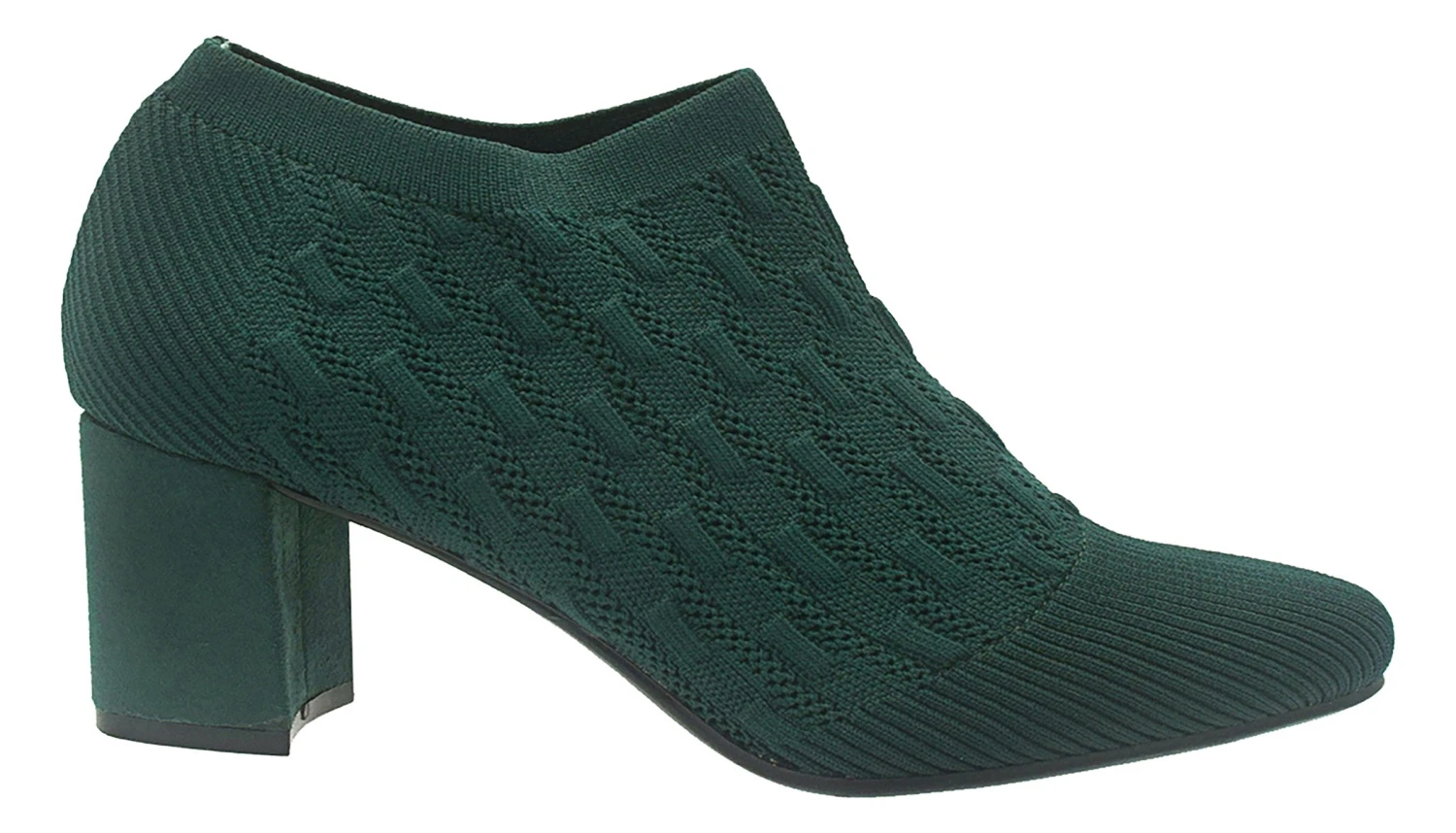 - Soft knit fabric upper in a block heel bootie style with an almond toe