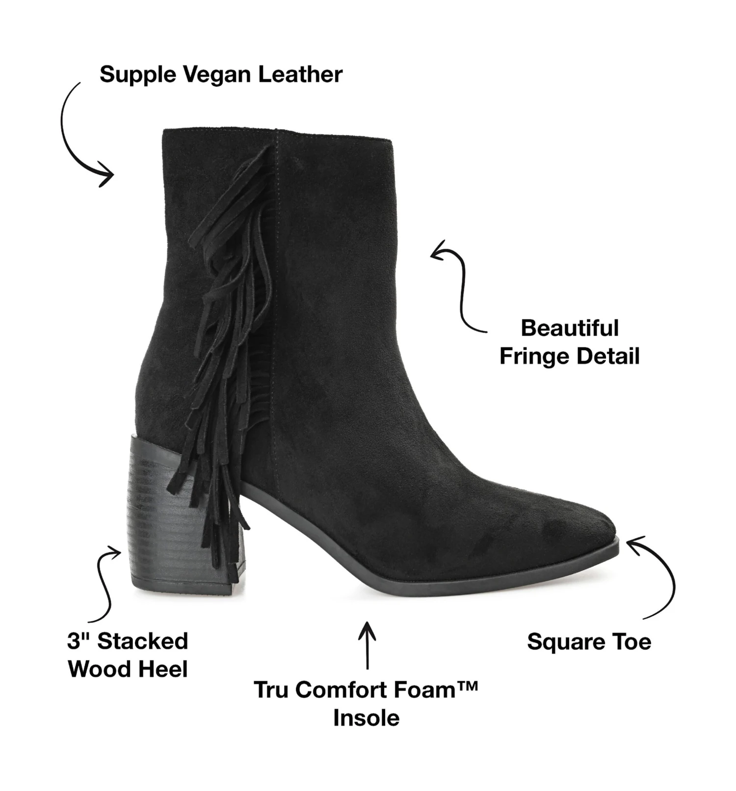- Vegan leather upper in a block heel bootie style with a square toe