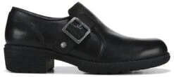 Hit the open highway with the windows down in these comfortable Eastland Open Road loafers. Leather upper in a slip-on casual loafer style with a round plain toe. A leather strap with a decorative buckle detail weaves through the instep, tonal stitching and heel overlay accents throughout. Textile lining and cushioning insole. Rubber traction outsole. 1 1/4 inch heel.