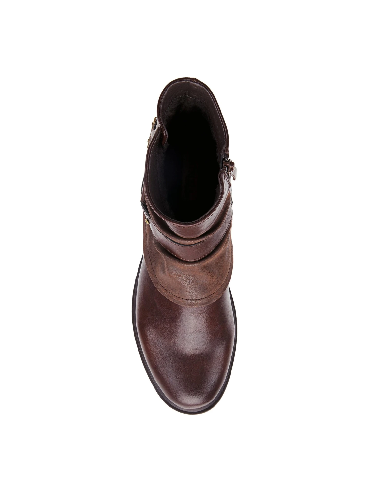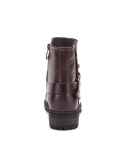- Synthetic leather upper in a motorcycle boot style with a round toe