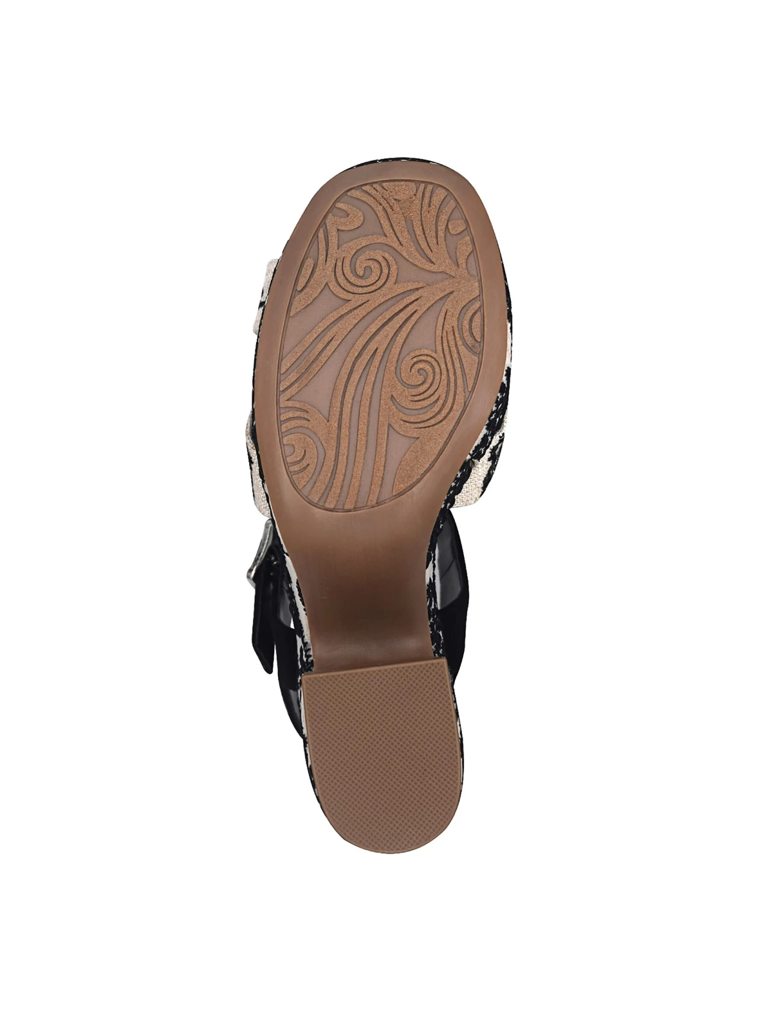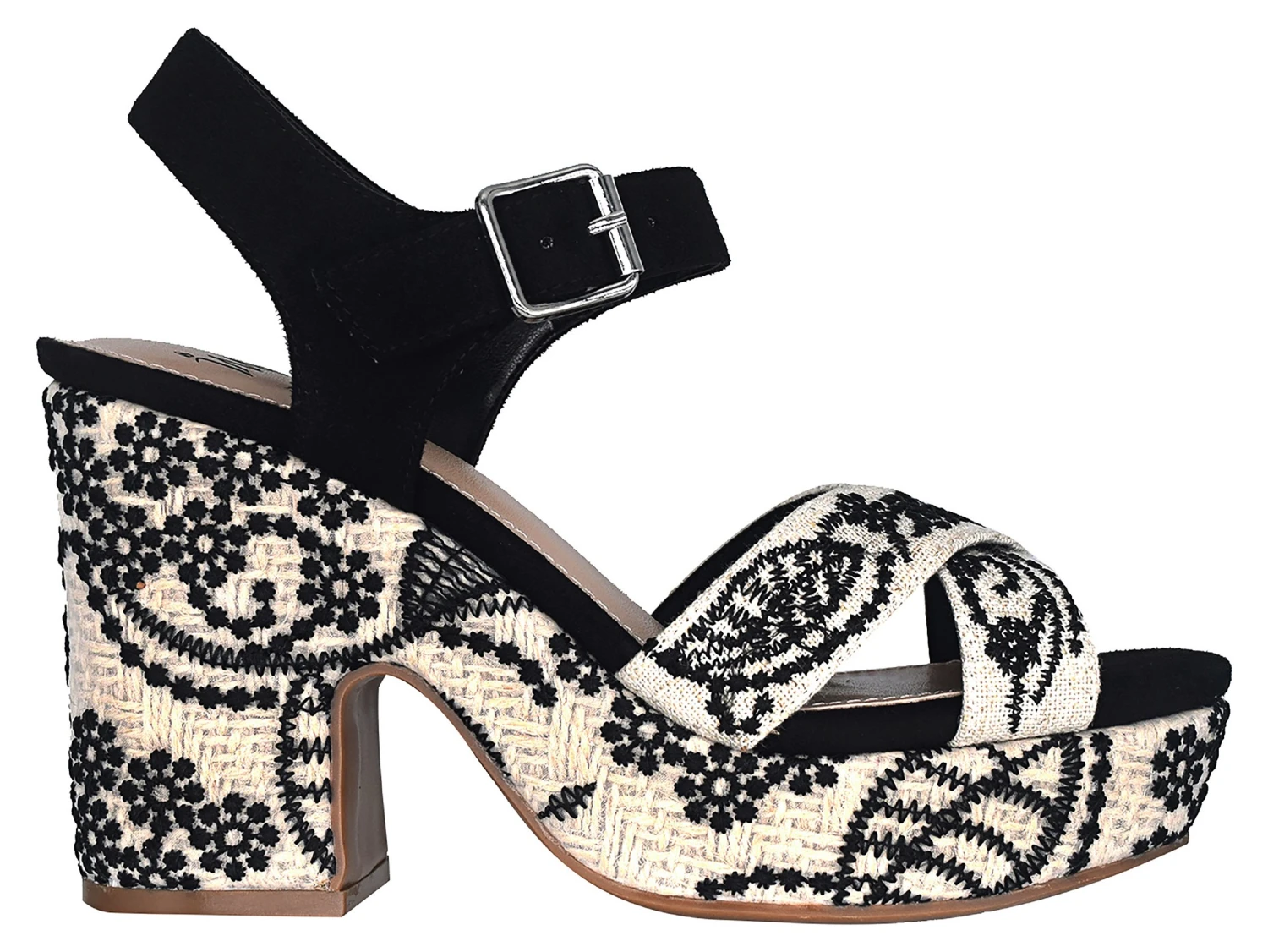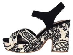 - Fabric upper in a platform sandal style with a square toe