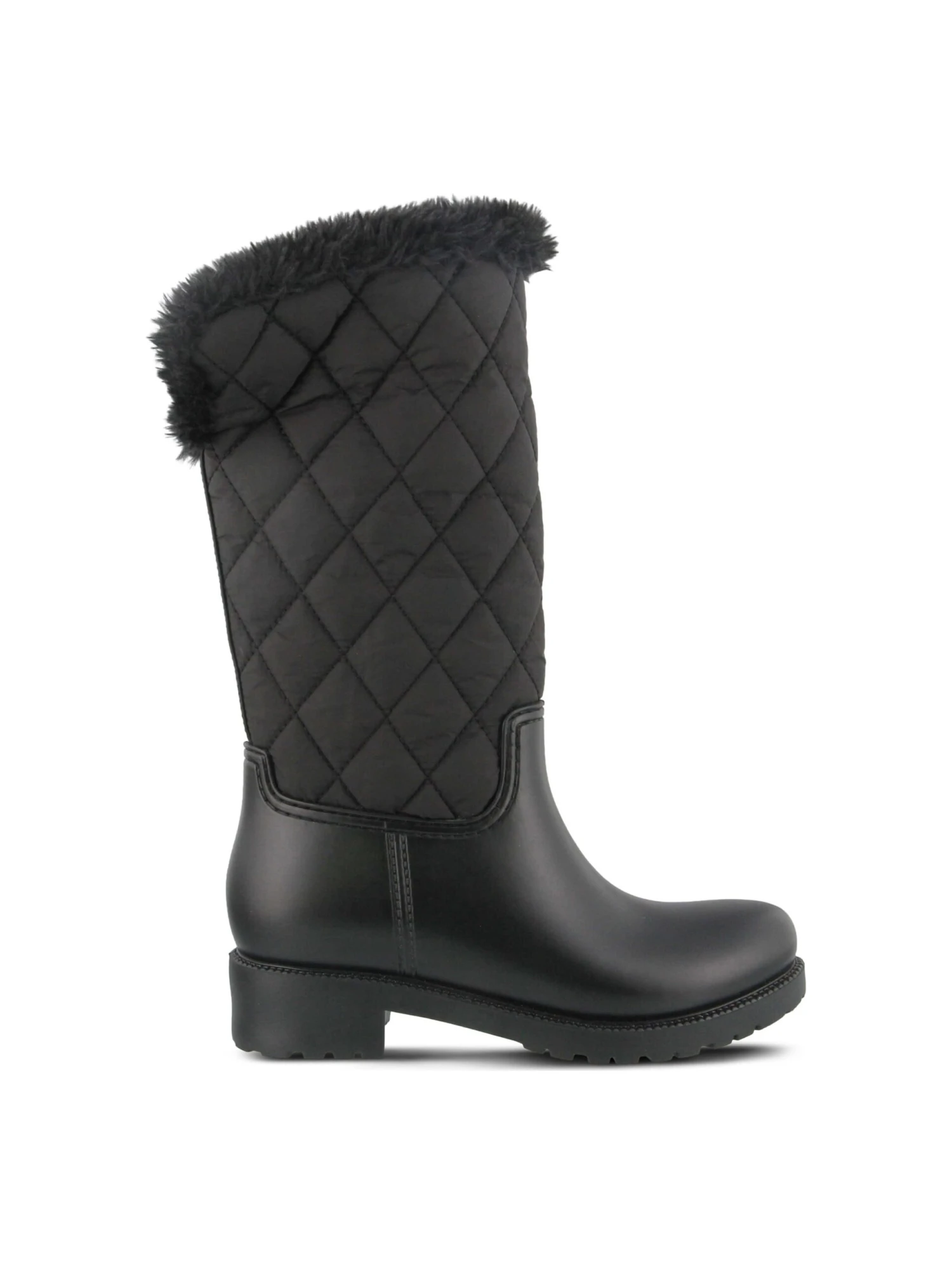 - Water-resistant nylon upper in a knee-high winter boot style with a round toe