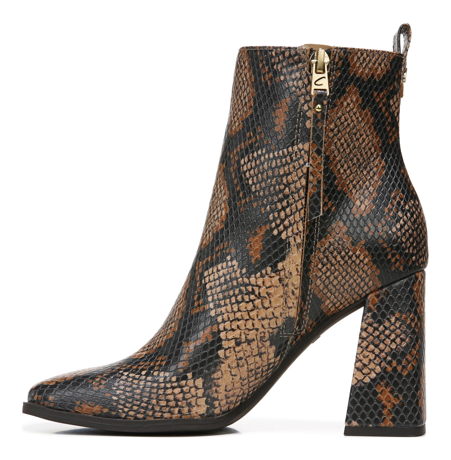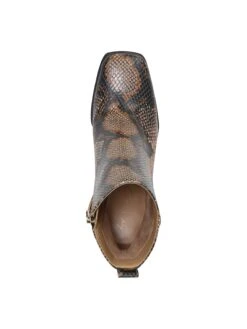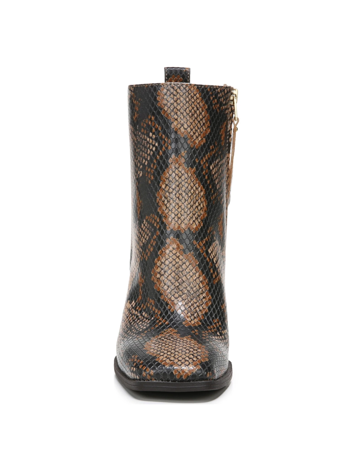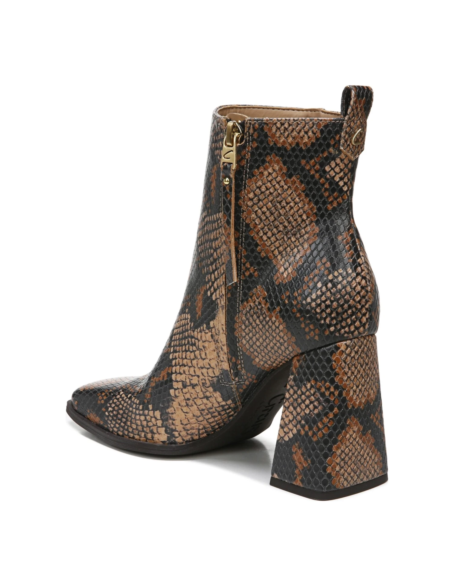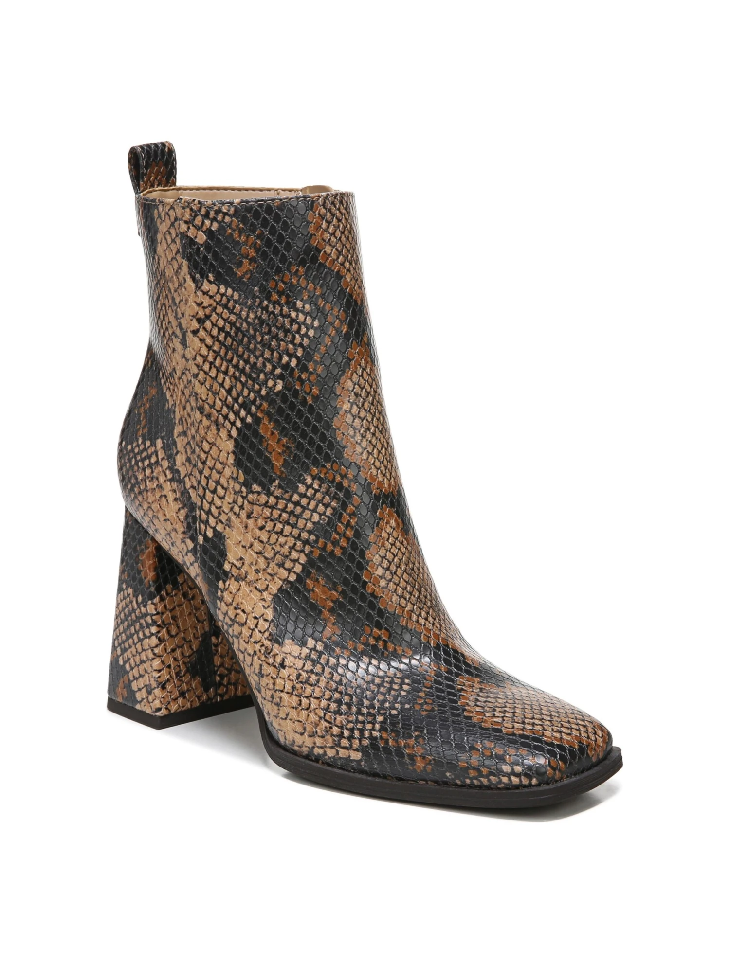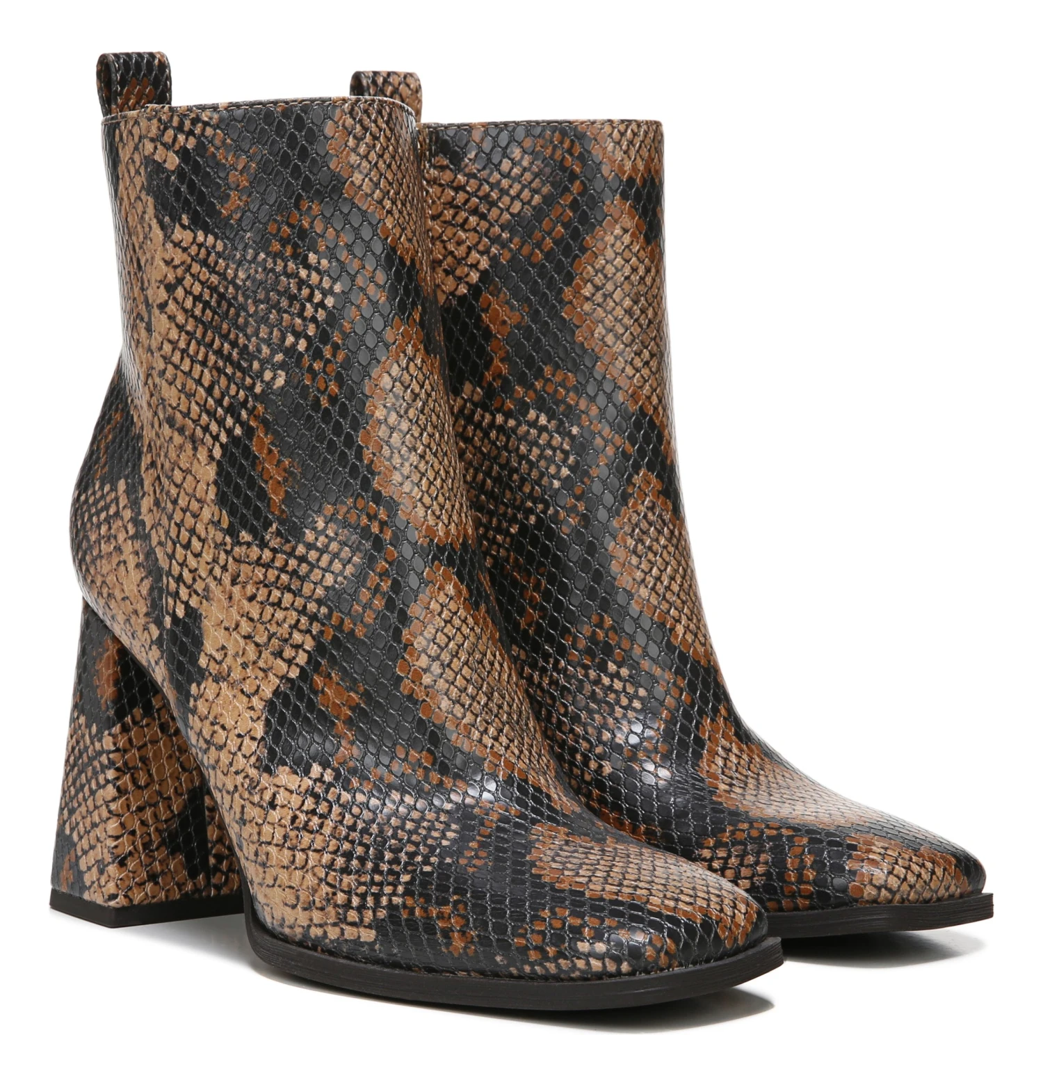 - Faux leather upper in a block-heel bootie style with square toe