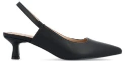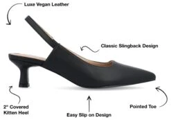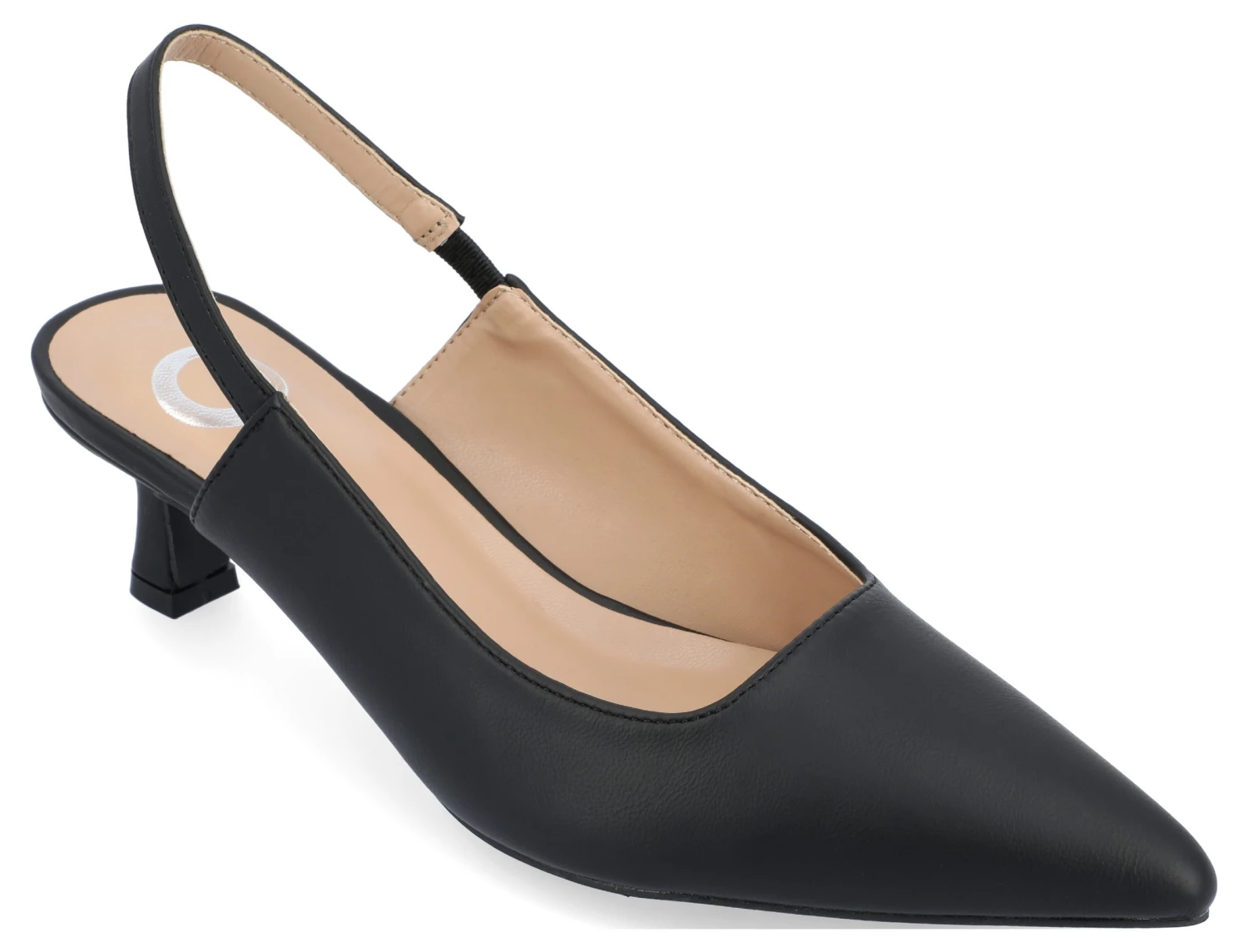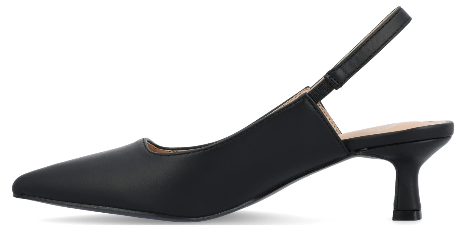 There isn’t an outfit the Women’s Paulina Wide Slingback Pump by Journee Collection can’t handle, from cocktail dresses to your comfiest skinny jeans. This pointed-toe silhouette features a soft padded footbed and lux vegan leather for a comfy fit. A sling-back strap and a tiny kitten heel complete this retro must-have look.
