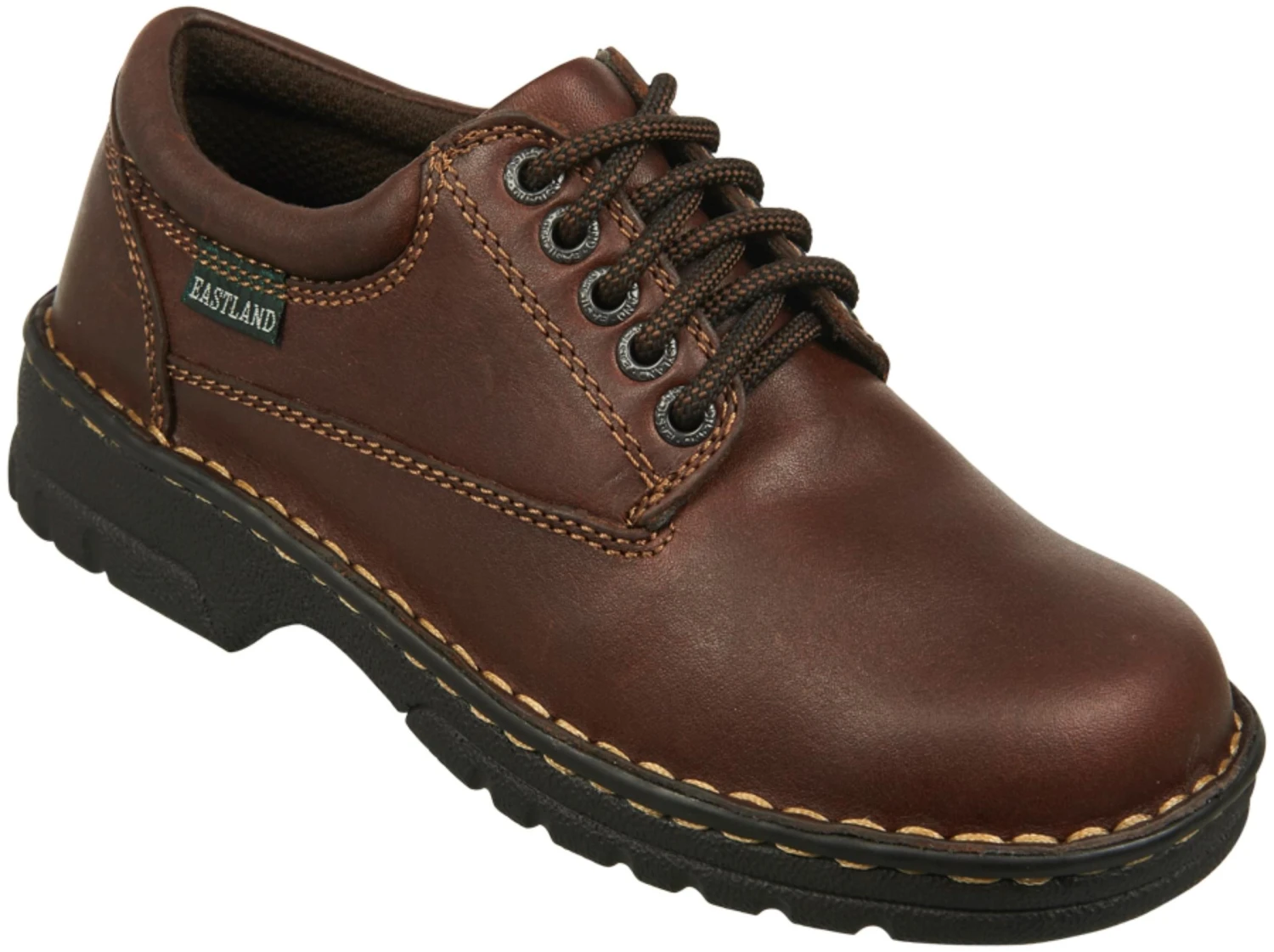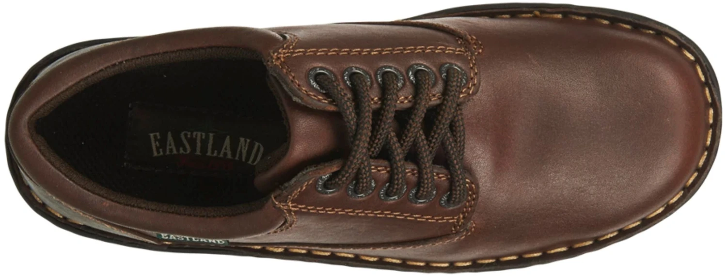 Eastland keeps it timeless and classy with these smart and sturdy Plainview oxfords. Soft full grain leather upper in a casual oxford style with a round plain toe. Contouring double stitching and an Eastland side logo tag add classic detail. Five eyelet grommeted lacing and a smooth leather padded collar and tongue create a comfortable, customizable fit. Textile lining and cushioning footbed, flexible stitched midsole. Durable polyurethane traction outsole with a sturdy 1 1/4 inch heel.