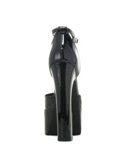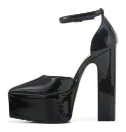 - Patent leather upper in a platform heel style with a pointed toe