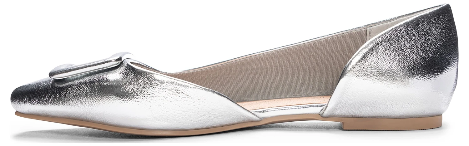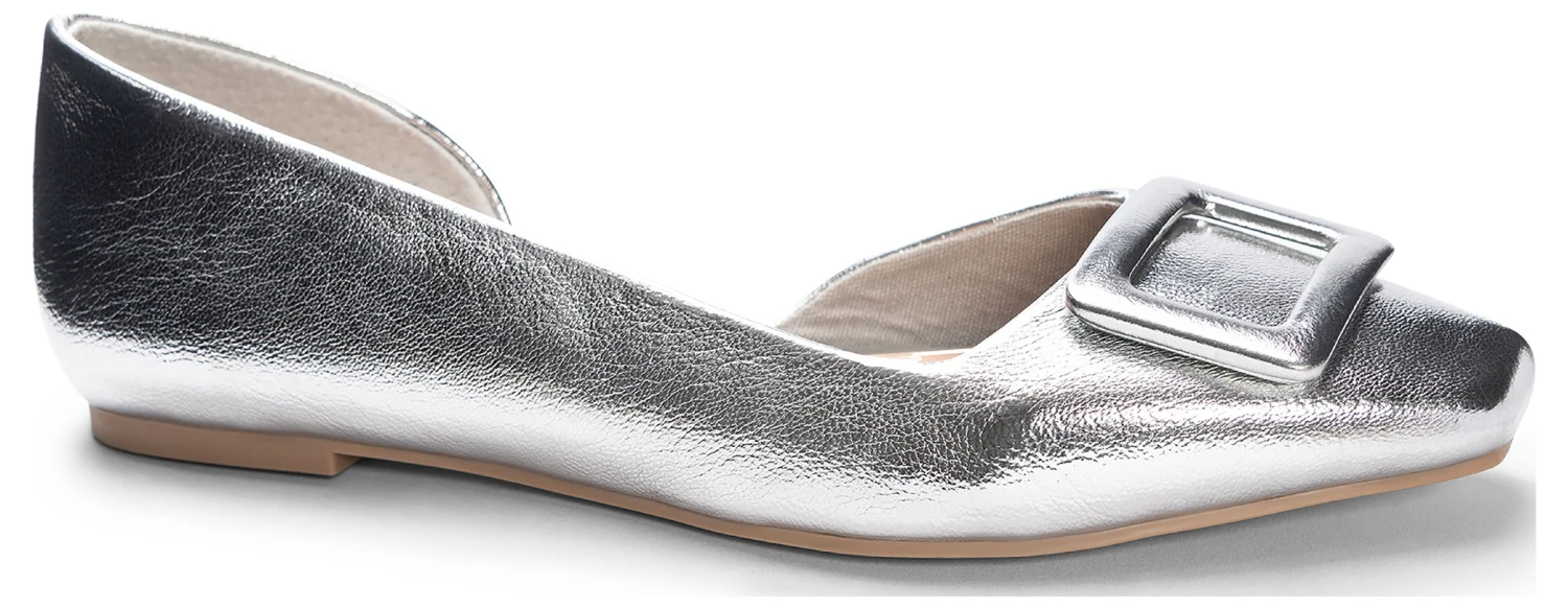 - Synthetic or microsuede upper in a flat style with a snip toe