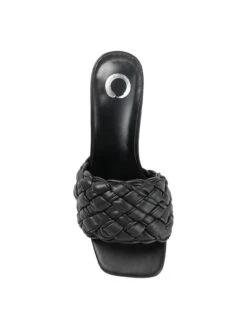 - Vegan leather upper in a stiletto heel style with an open toe.