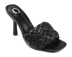 - Vegan leather upper in a stiletto heel style with an open toe.