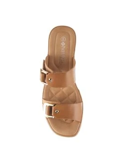 - Synthetic upper in a block heel dress sandal style with a square toe