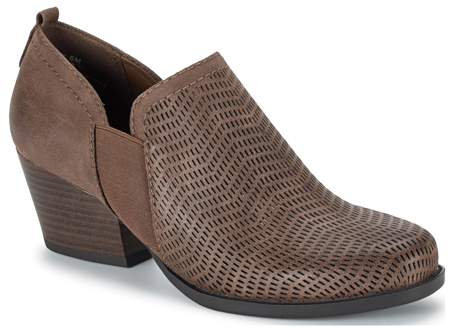 - Synthetic upper in a block heel ankle boot style with a round toe