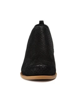 - Fabric upper in a block heel ankle boot style with a round toe