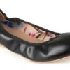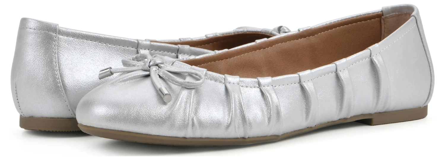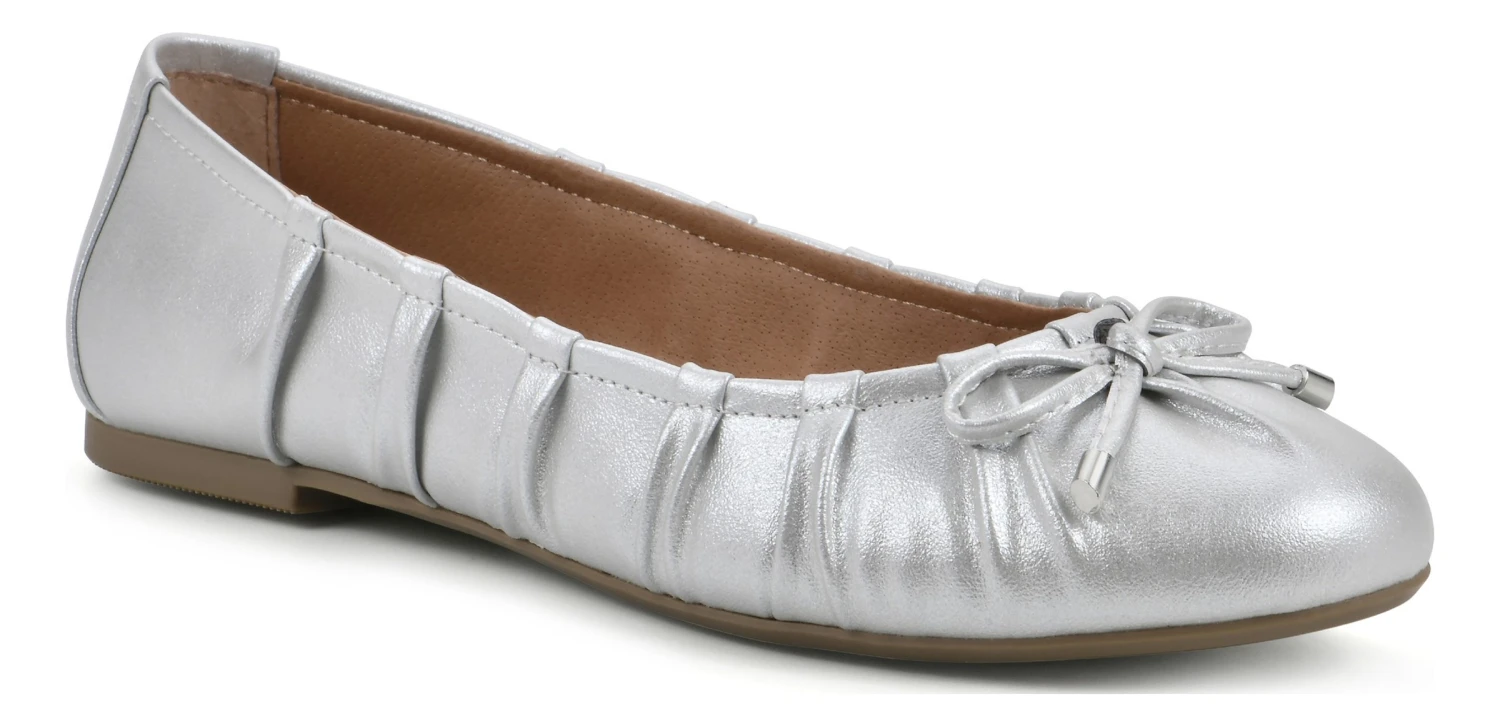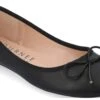 - Fabric or faux leather upper in a ballet flat with an almond toe