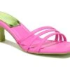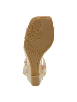 - Fabric upper in a wedge dress sandal style with a square open toe