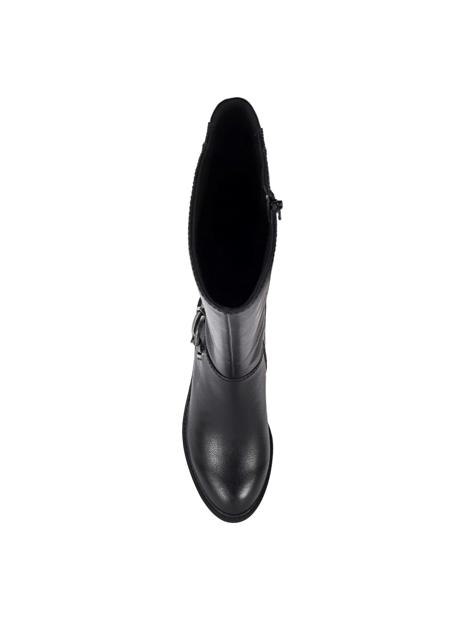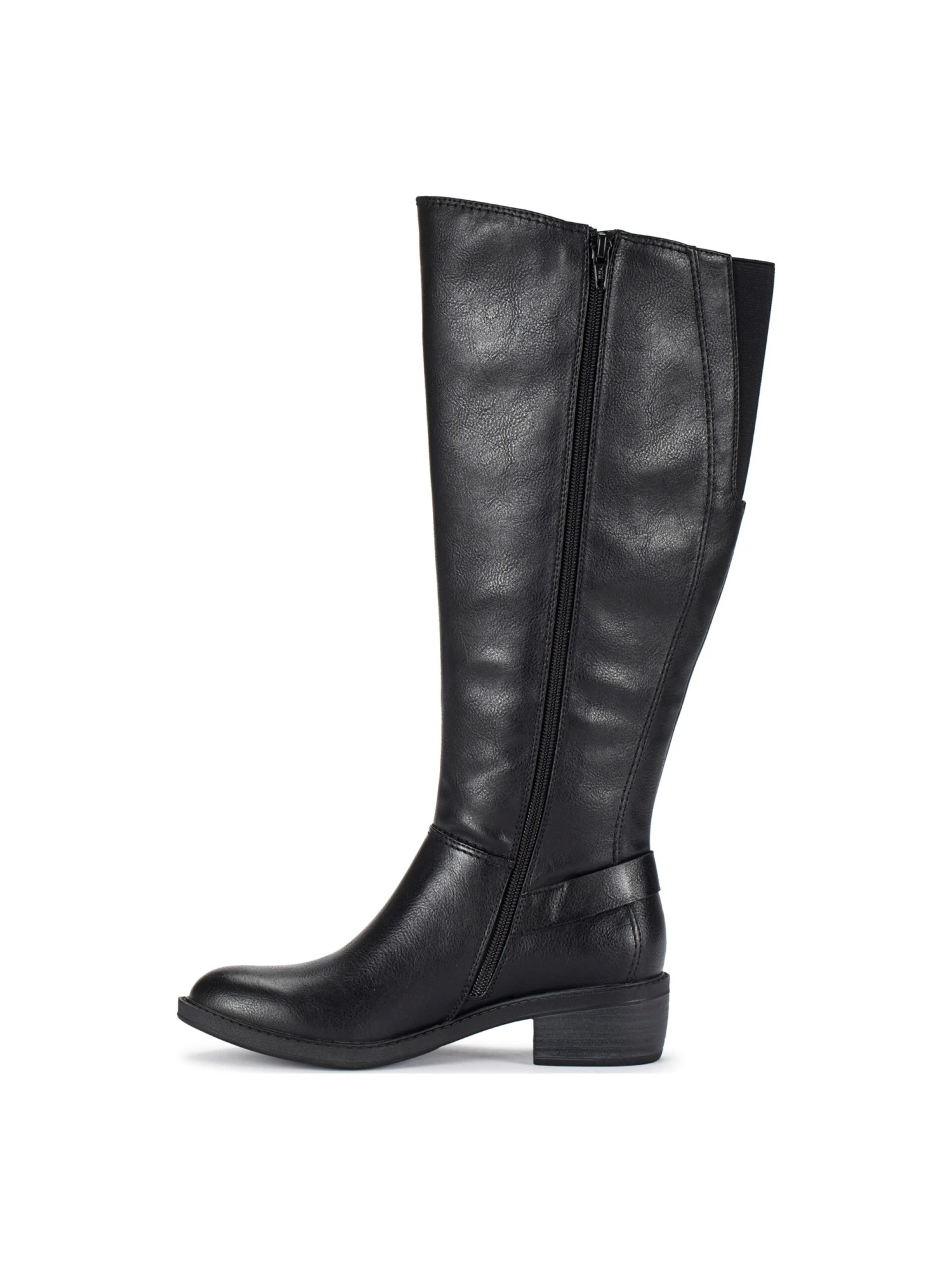 - Synthetic leather upper in a tall riding boot style with an almond toe