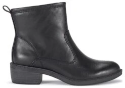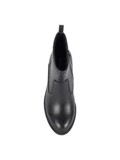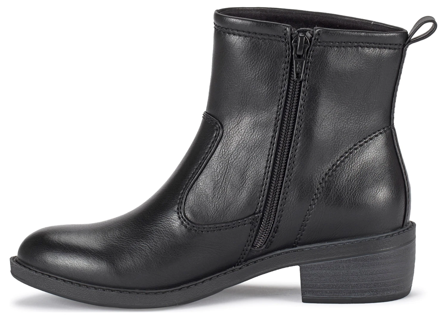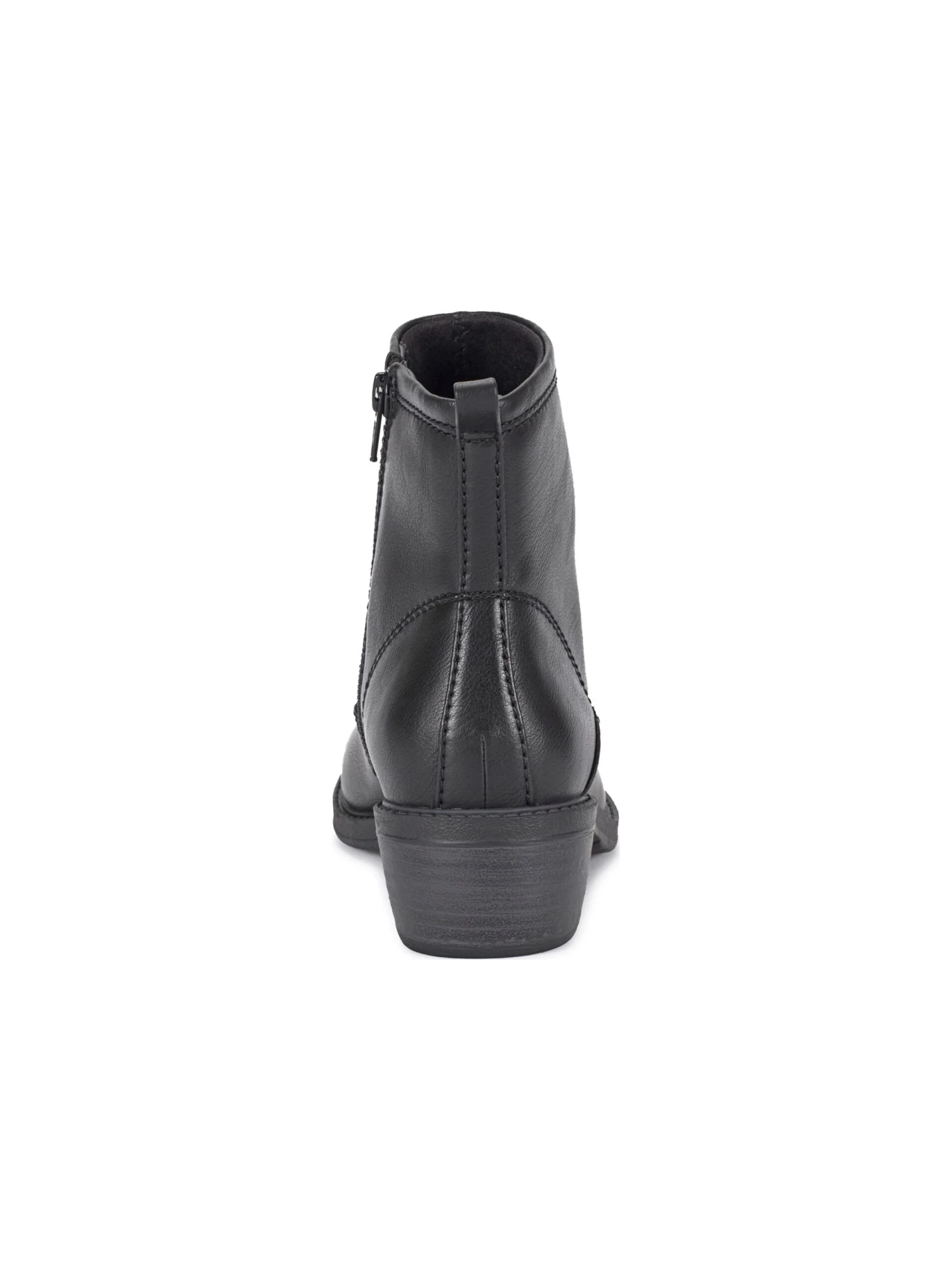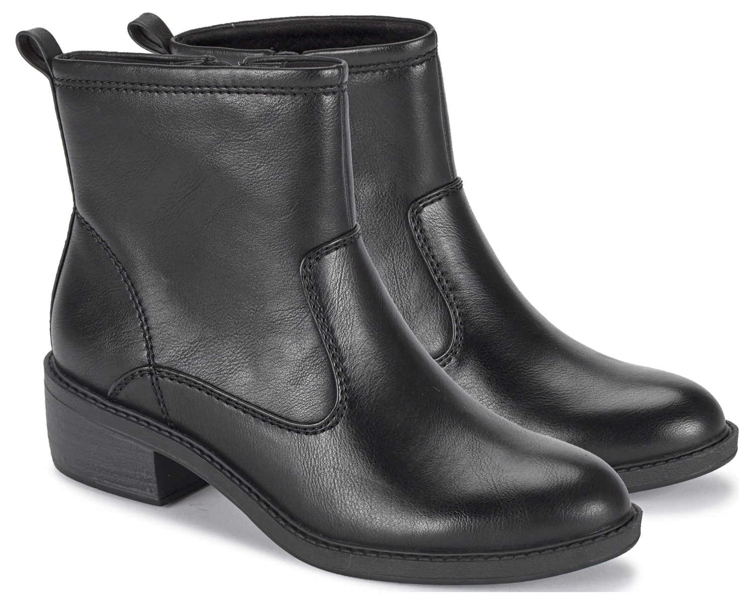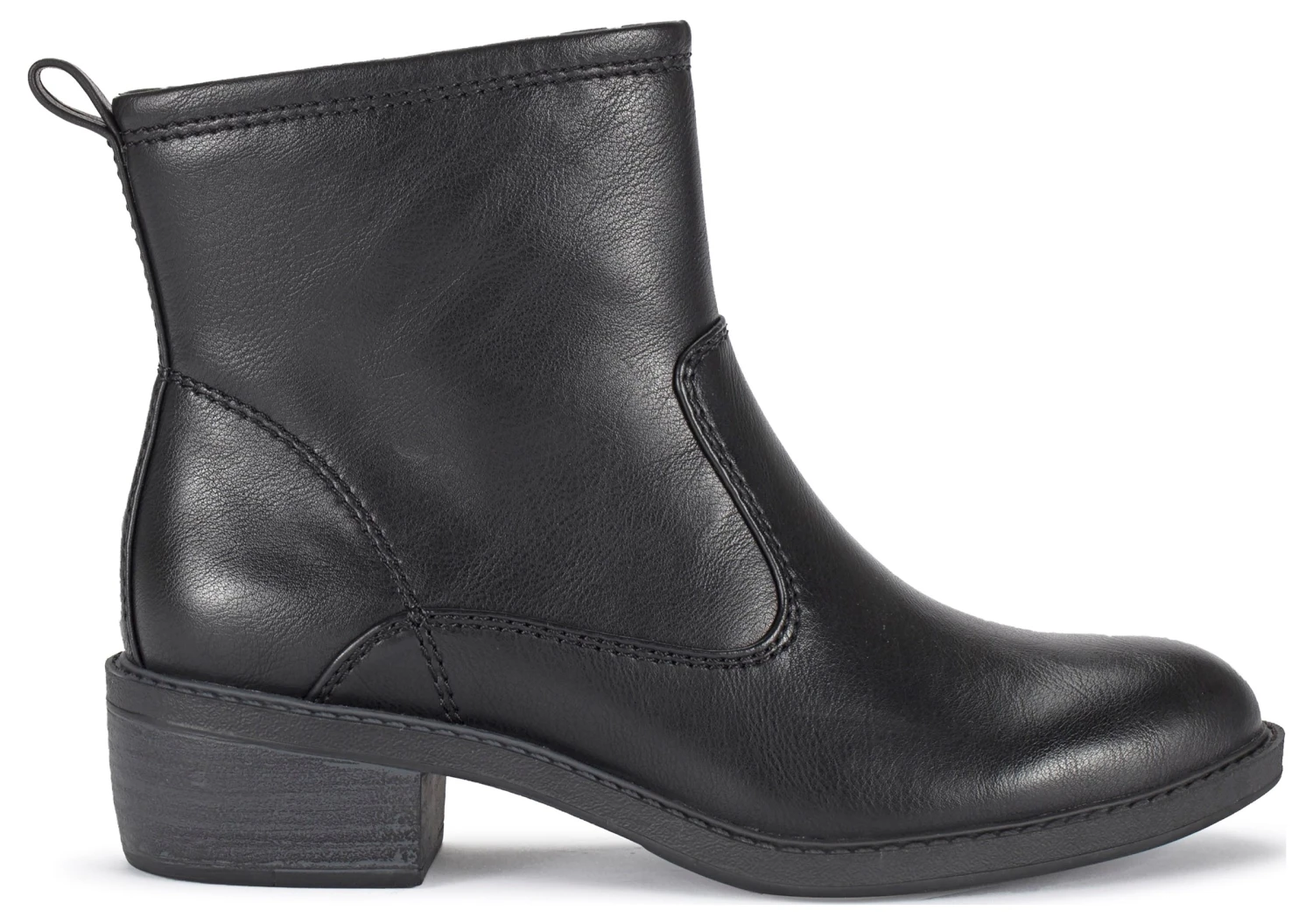 - Synthetic leather upper in a block heel bootie style with an almond toe