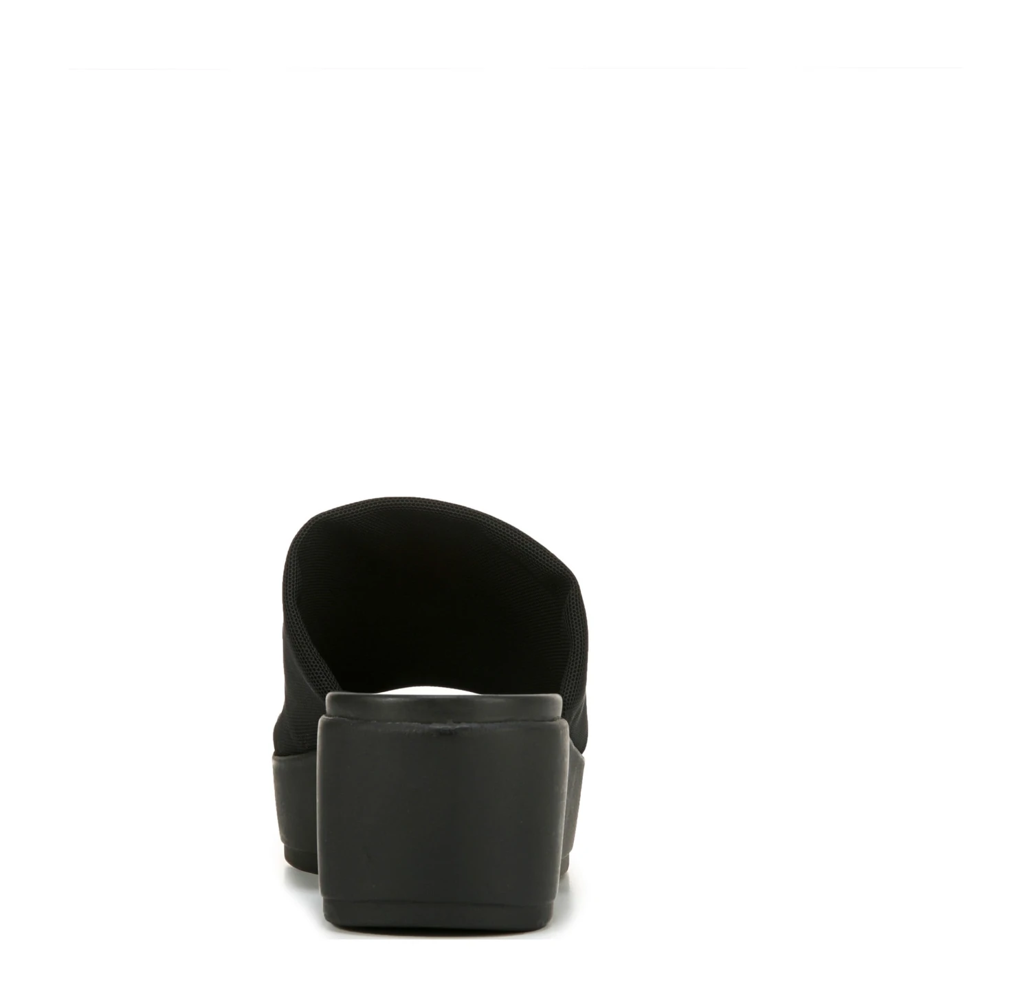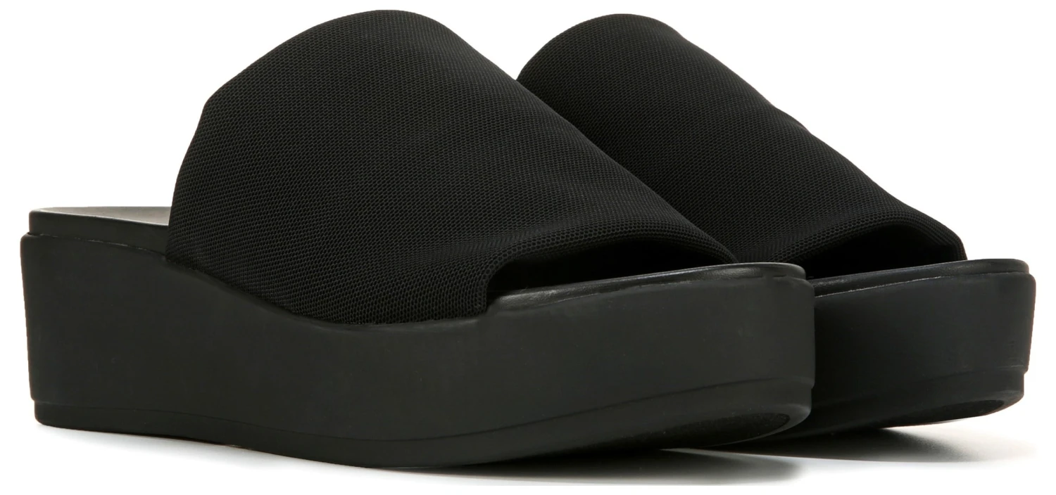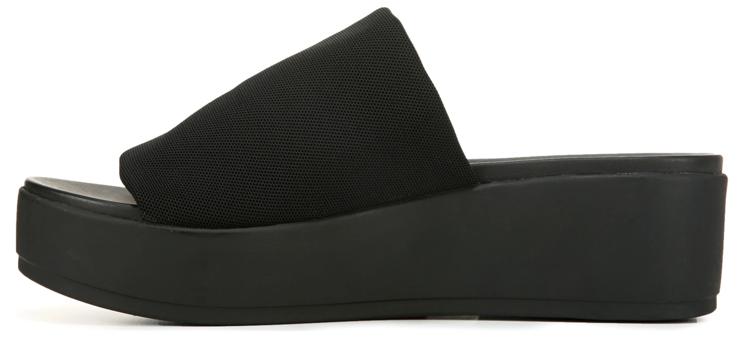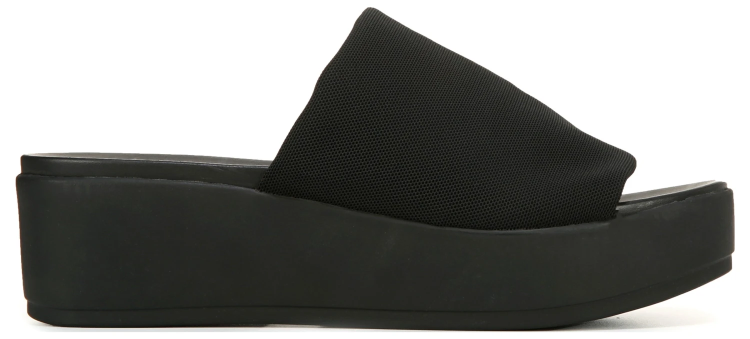 - Faux leather and mesh upper in a platform wedge sandal style with an open toe