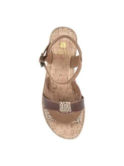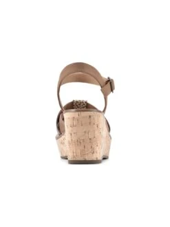 - Faux leather or fabric upper in a wedge sandal style with an open toe.