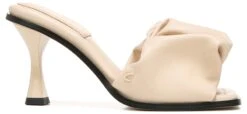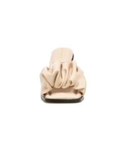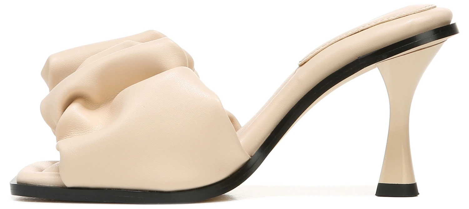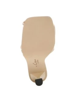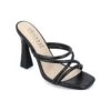 - Faux-leather upper in a slide dress sandal style with an open, square toe