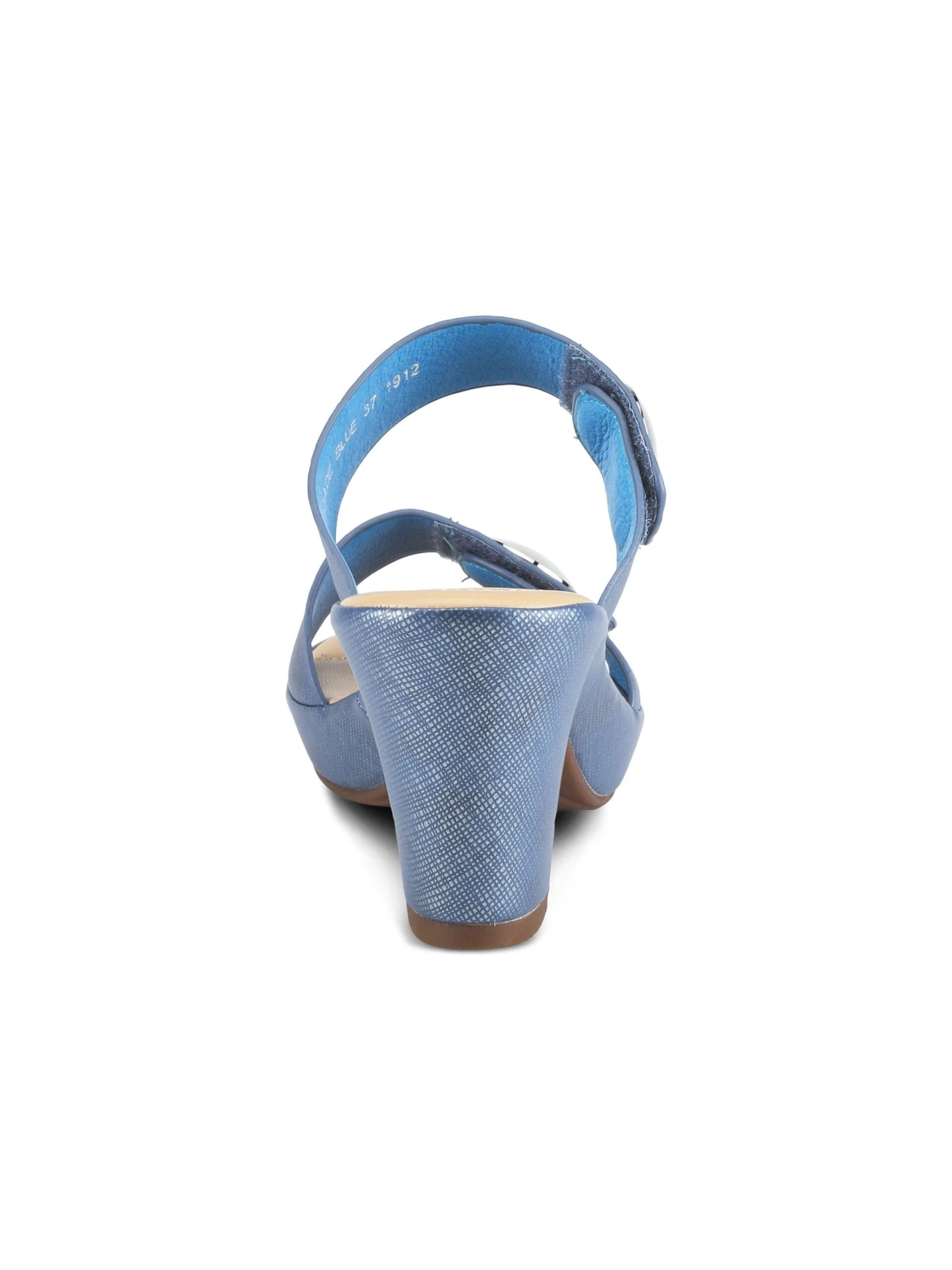 - Synthetic leather upper in a block heel dress sandal style with an open toe