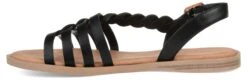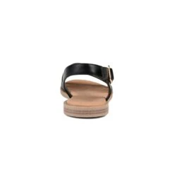 - Faux leather upper in a flat sandal style with an open toe.
