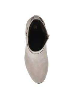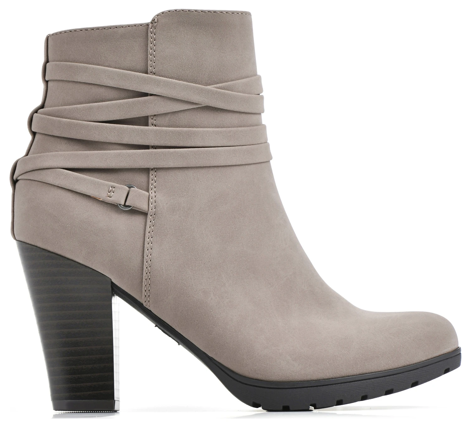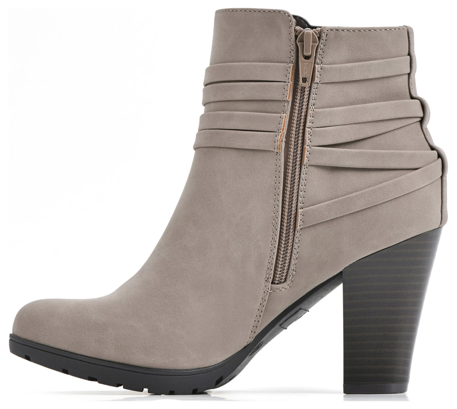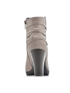- Faux-leather or fabric upper in a block heel bootie style with a round toe