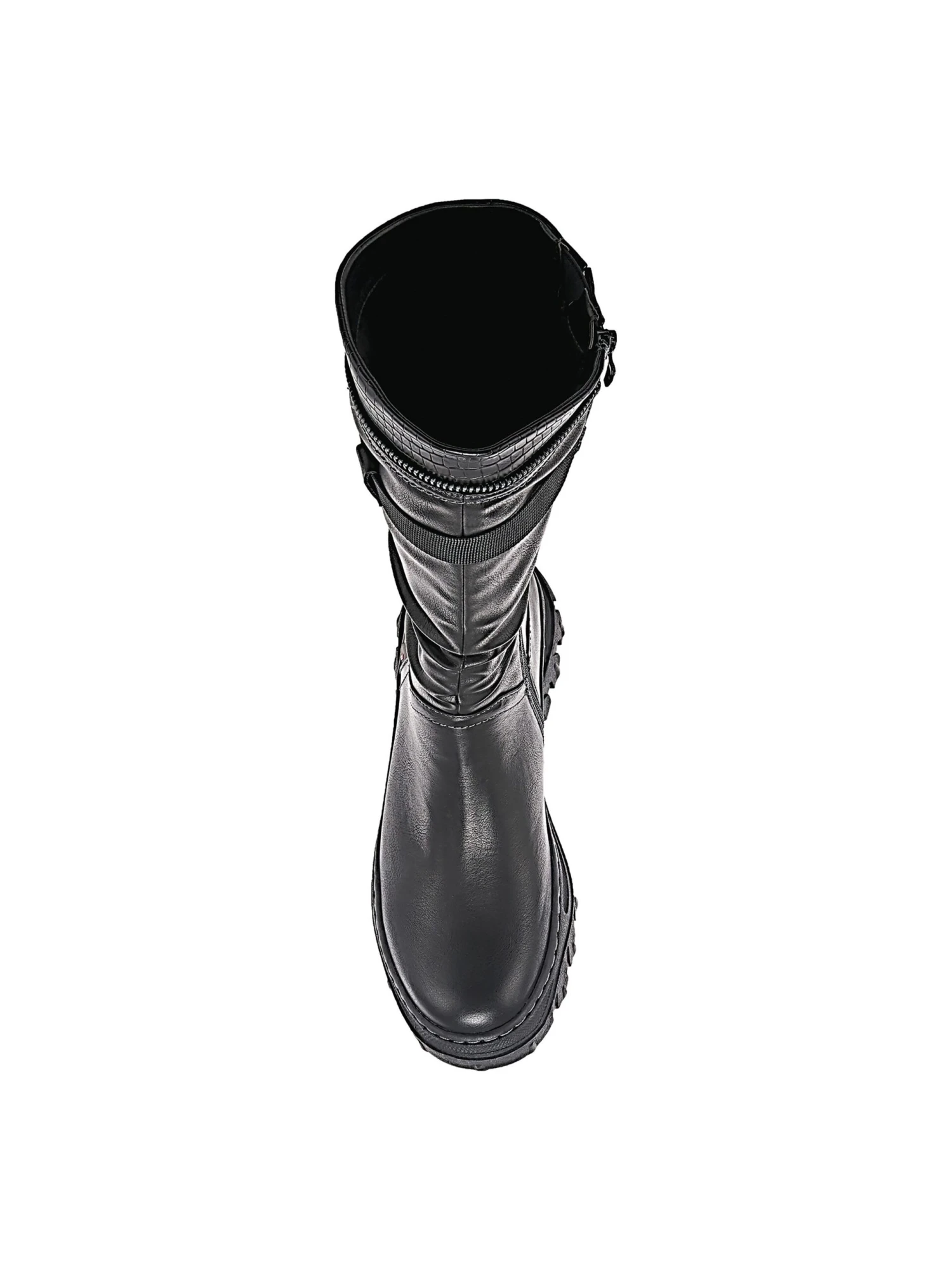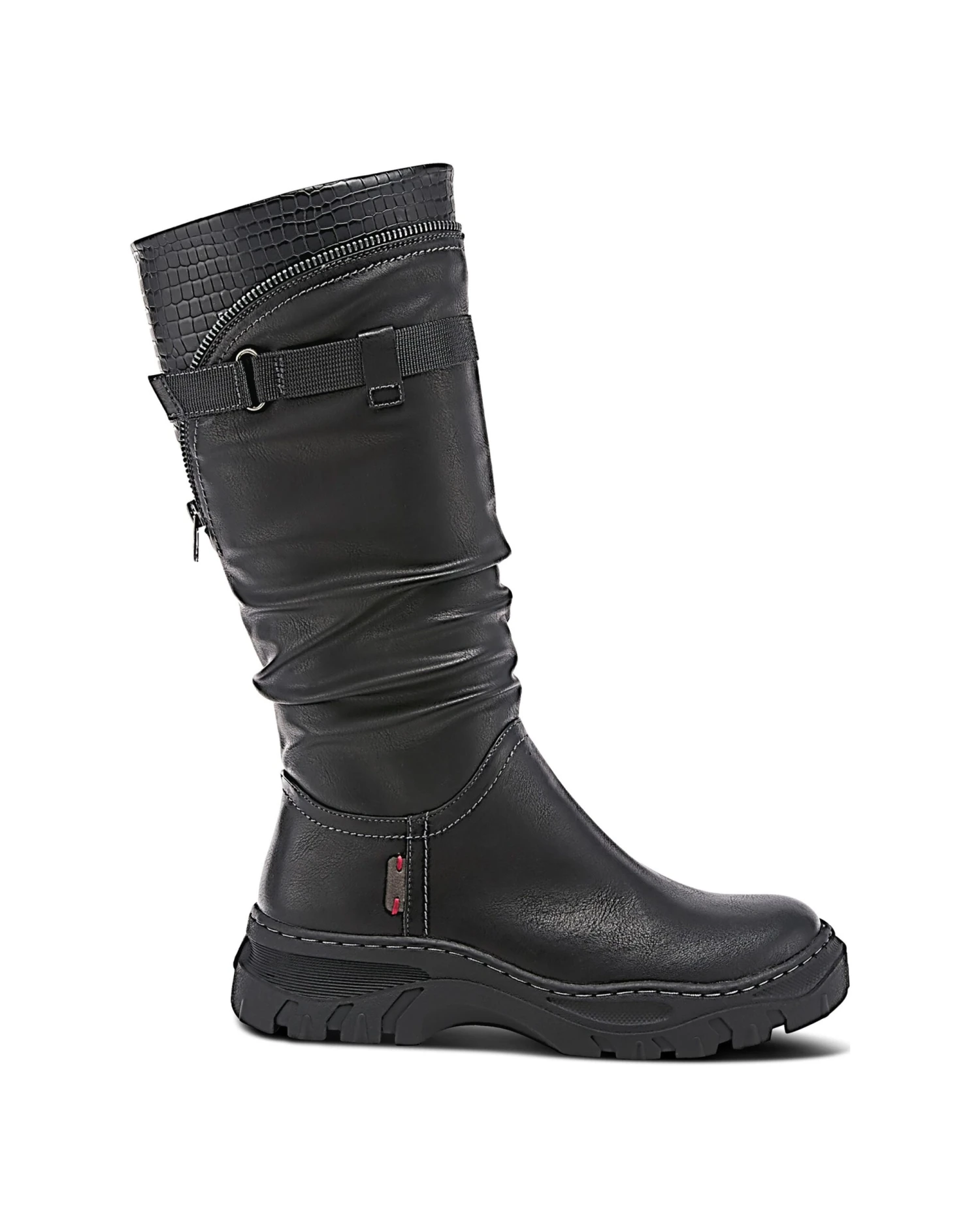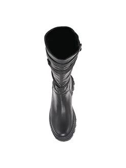 - Synthetic leather upper in a knee high boot style with a round toe