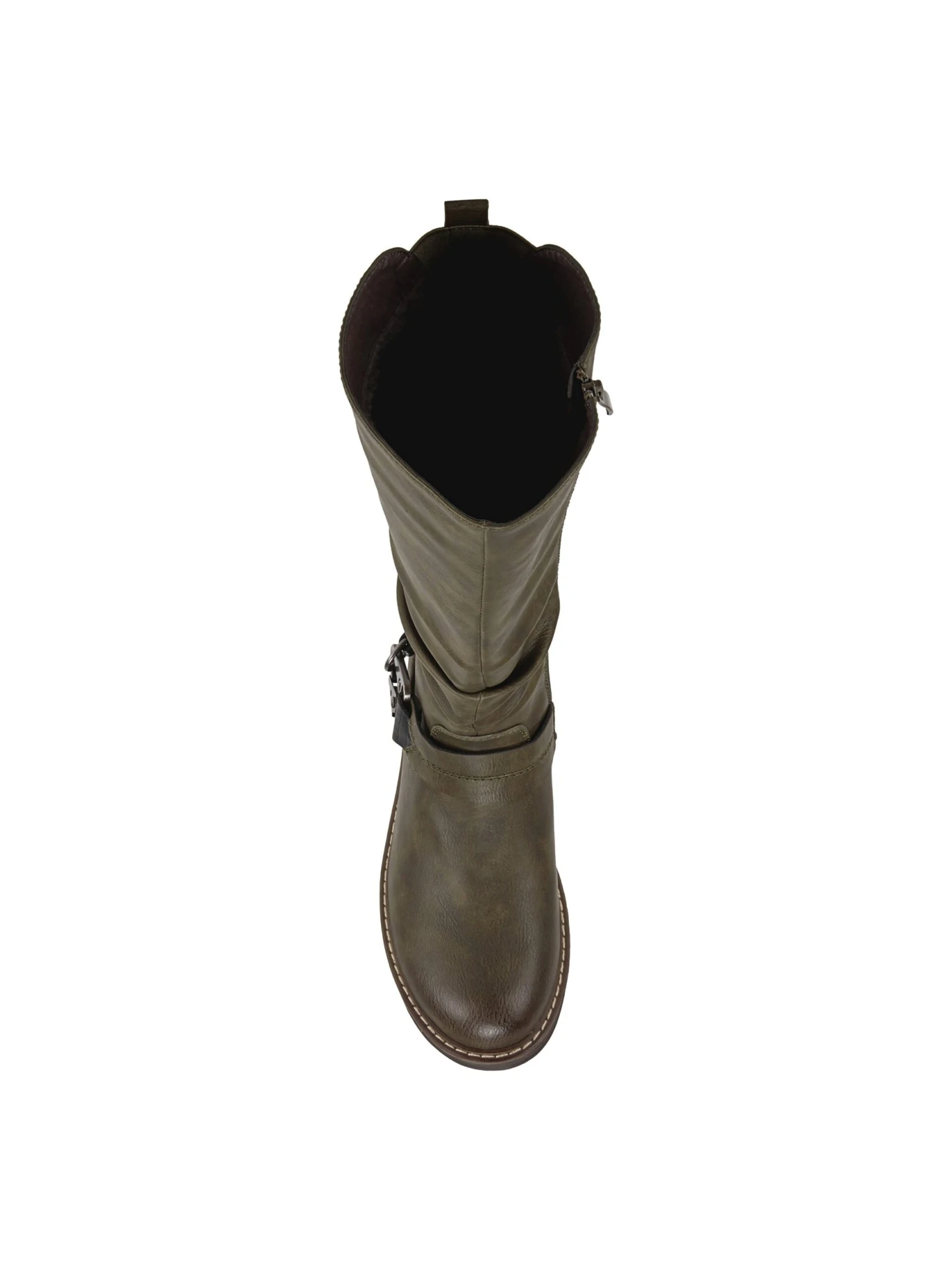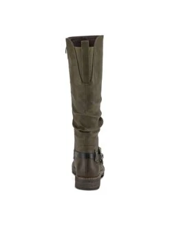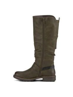 - Synthetic leather upper in a tall riding boot style with a round toe