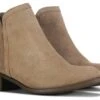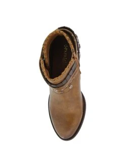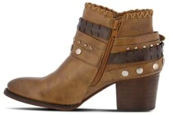 - Synthetic leather upper in a block heel bootie style with an almond toe
