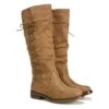 - Leather or suede upper in a dress knee-high boot style with an almond toe
