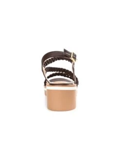 - Vegan leather upper in a block heel sandal style with an open toe.