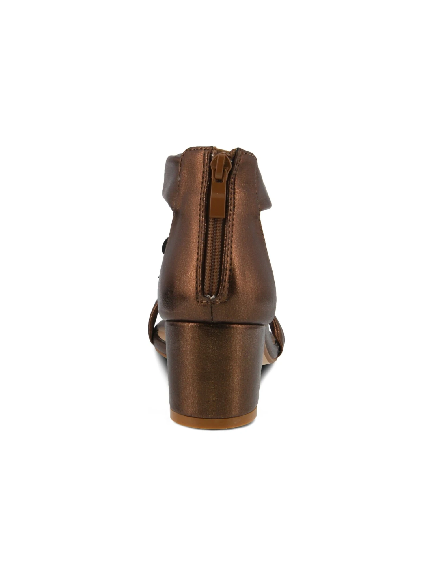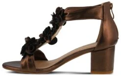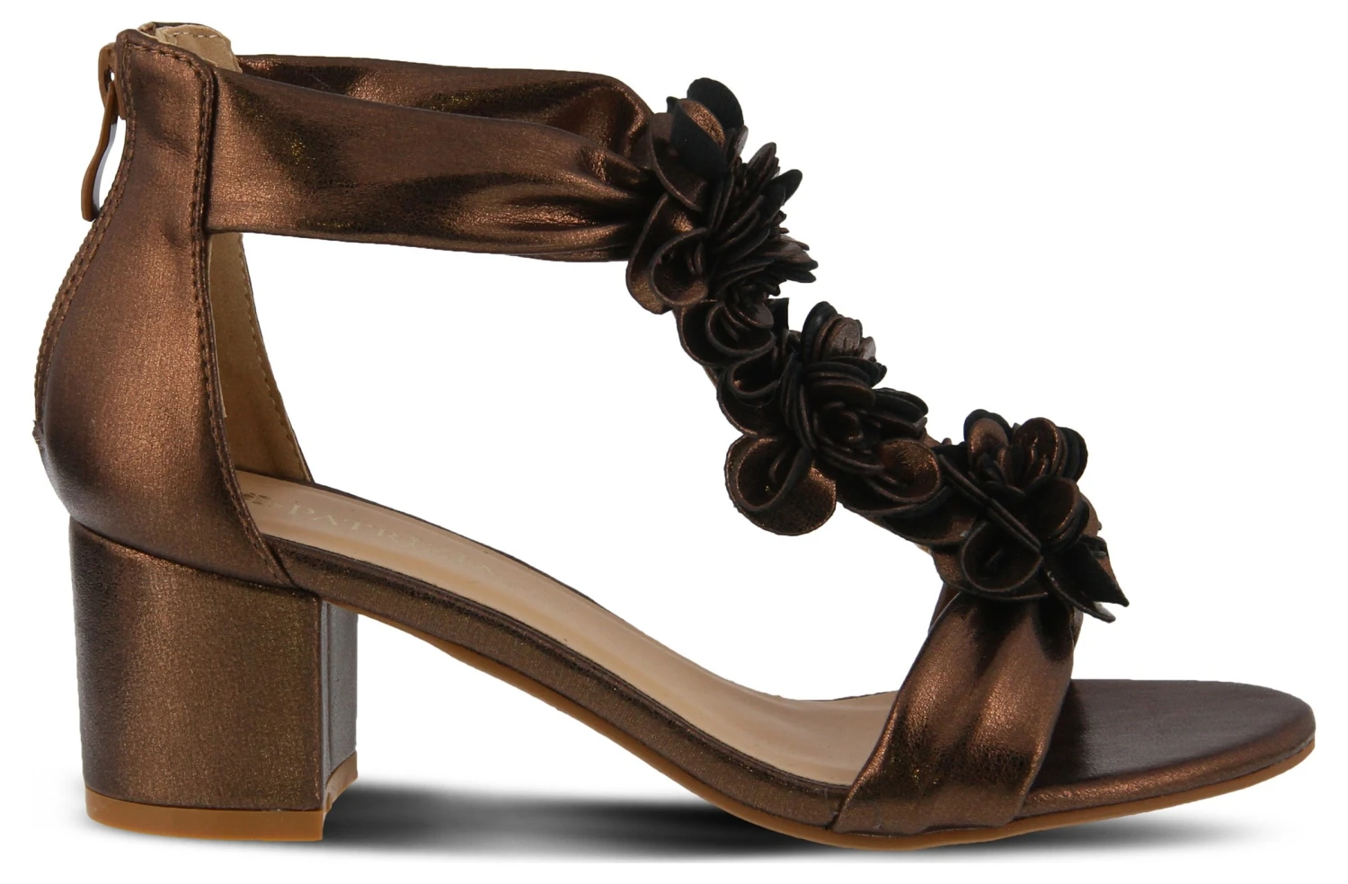 - Faux-leather upper in a block heel dress sandal style with an open toe