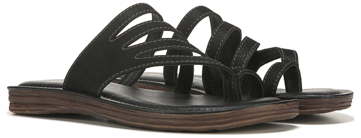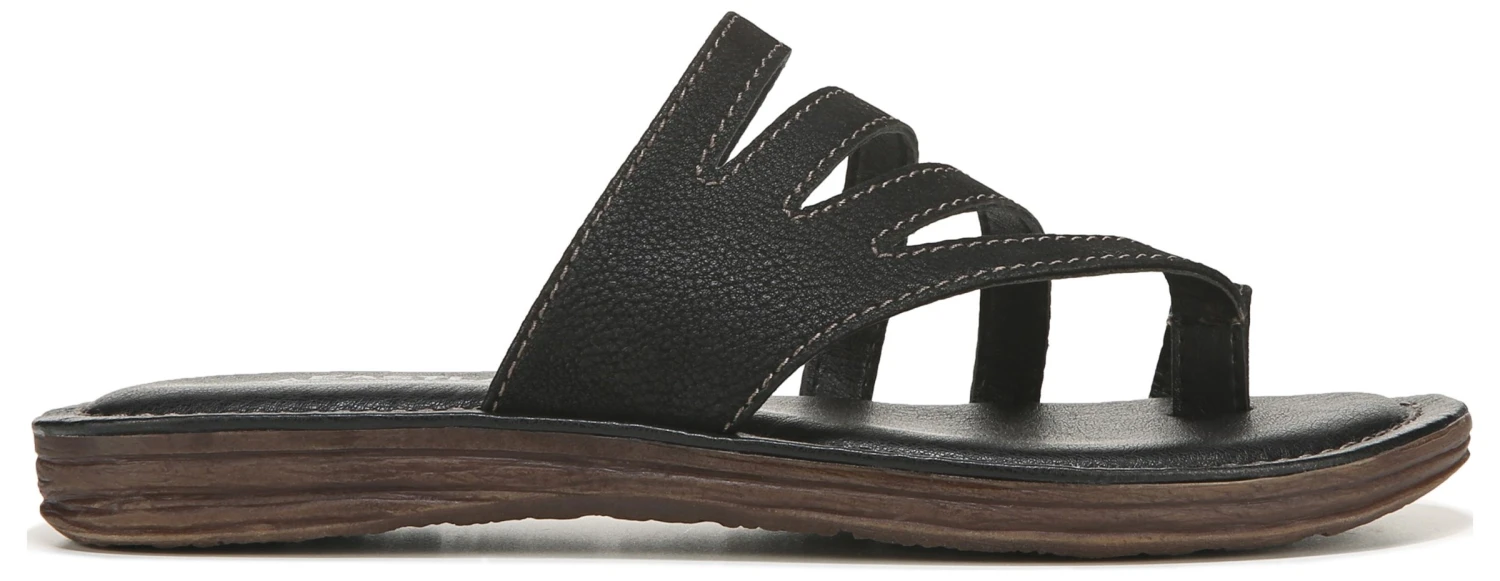 - Faux-leather upper in a slide sandal style with an open toe