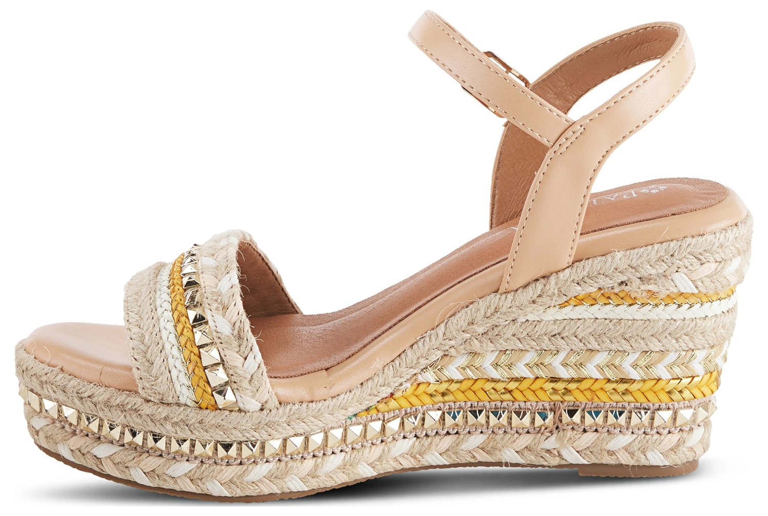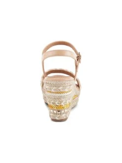 - Features a front strap bedazzled by pyramid studs and patterned 3.5″ wedge