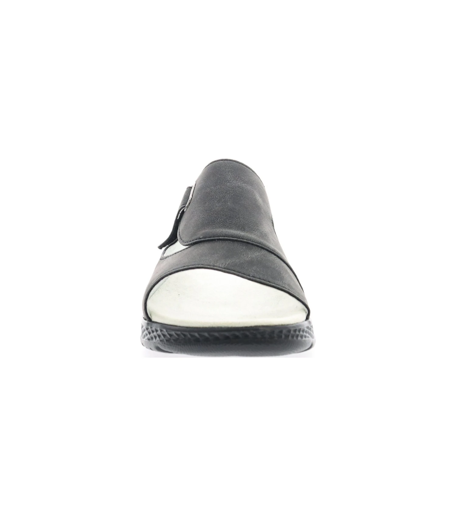 - Leather upper in a slide sandal style with an open round toe