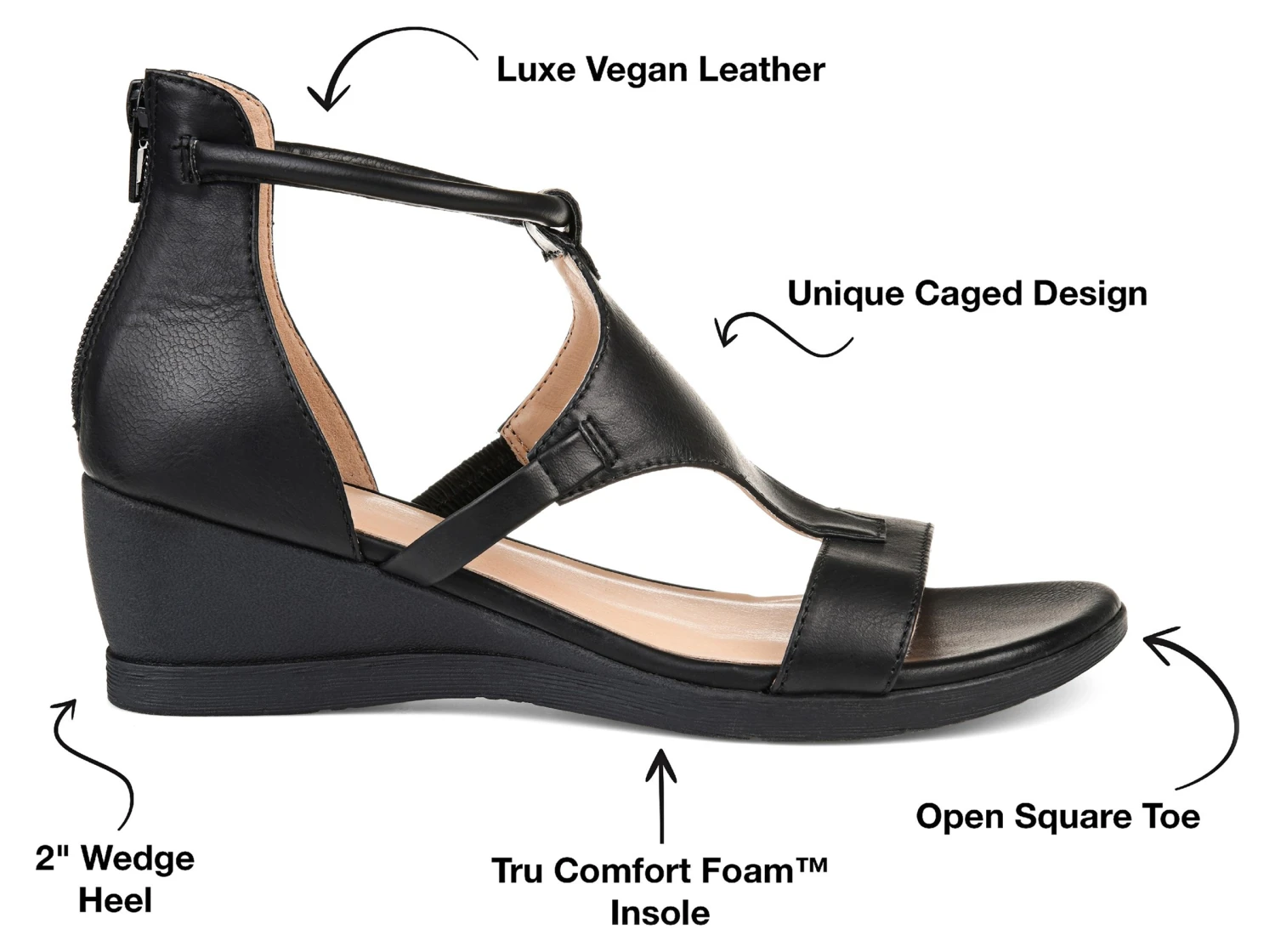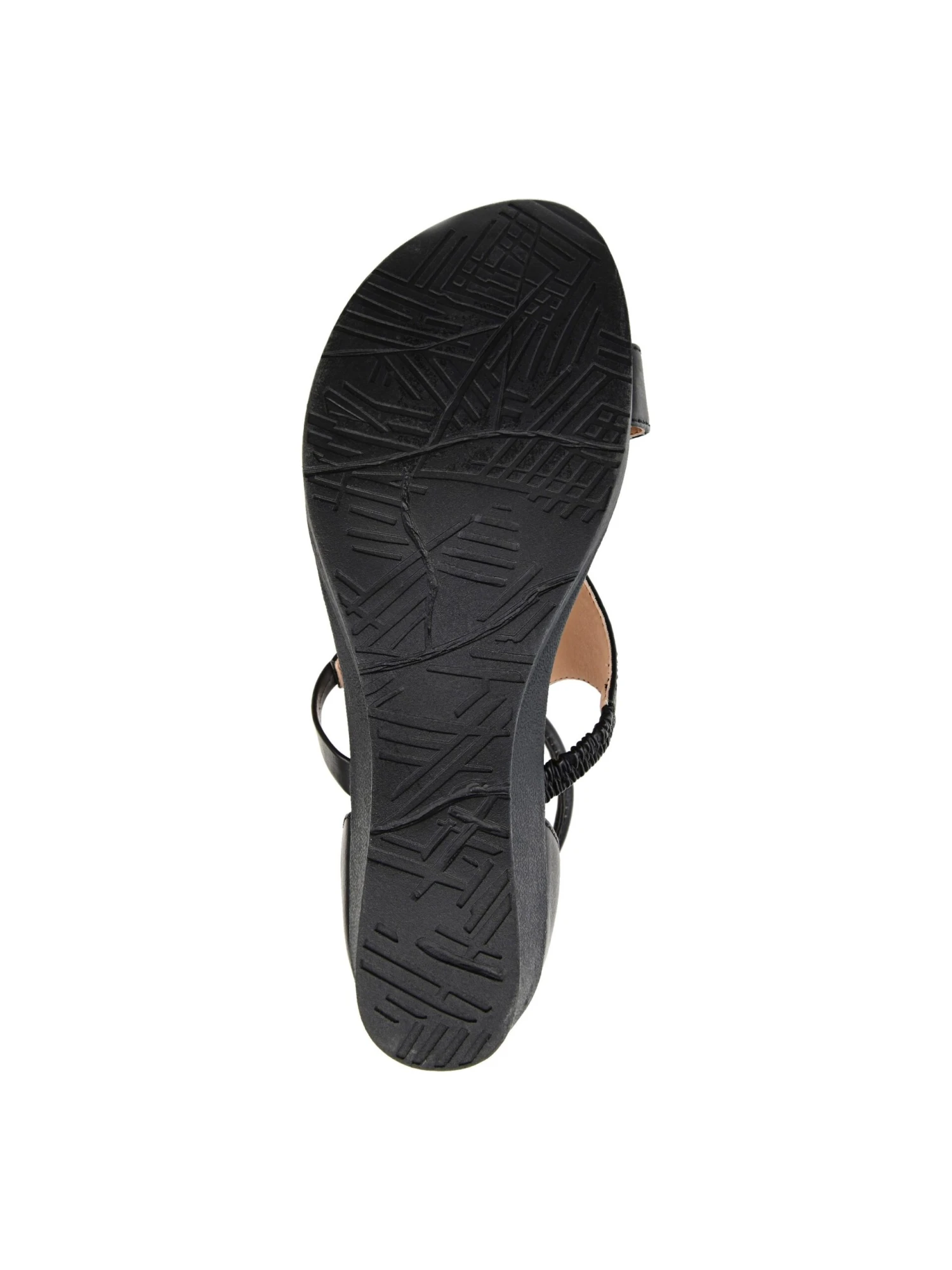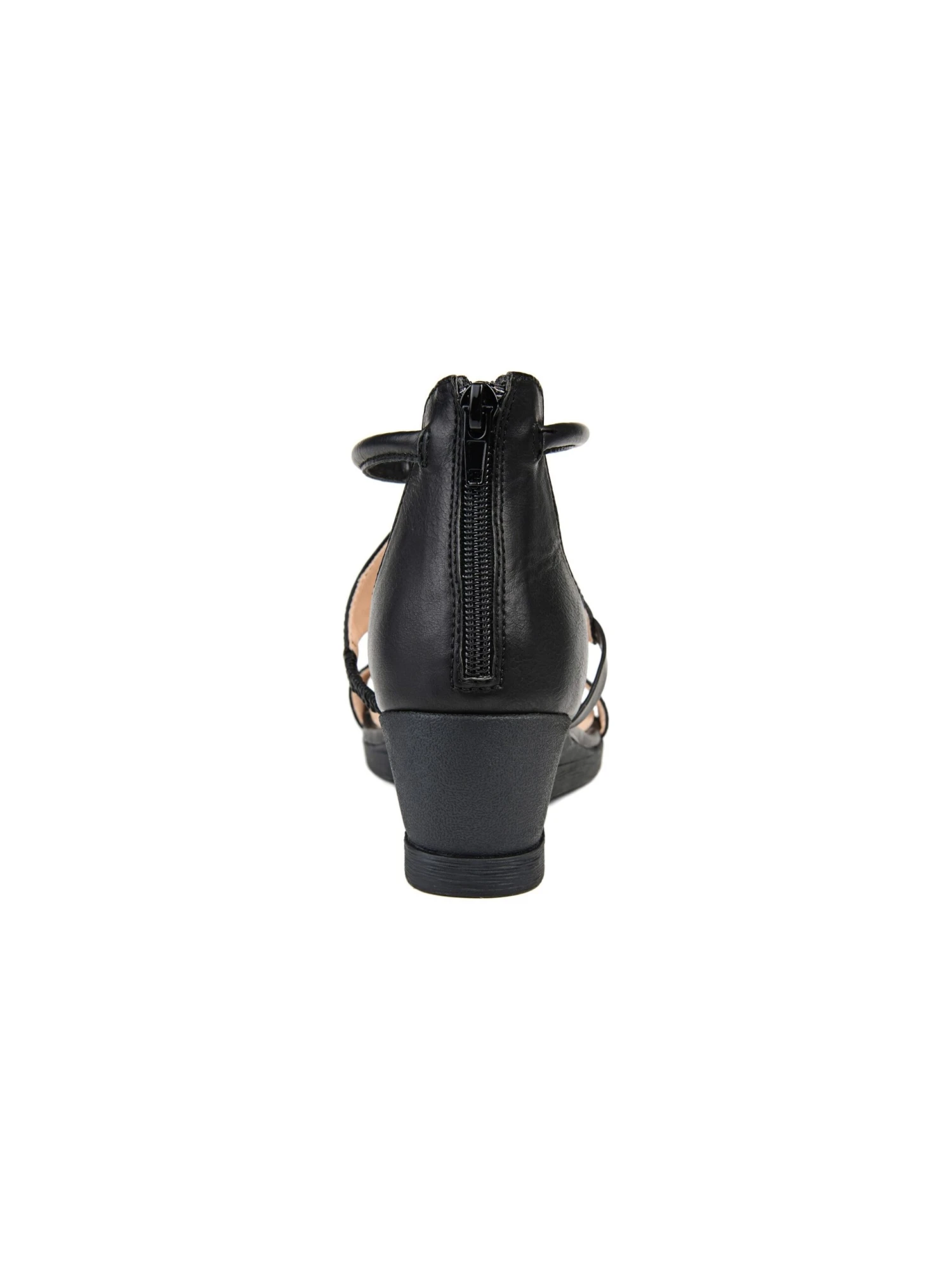 - Faux leather upper in a wedge sandal style with an open toe.