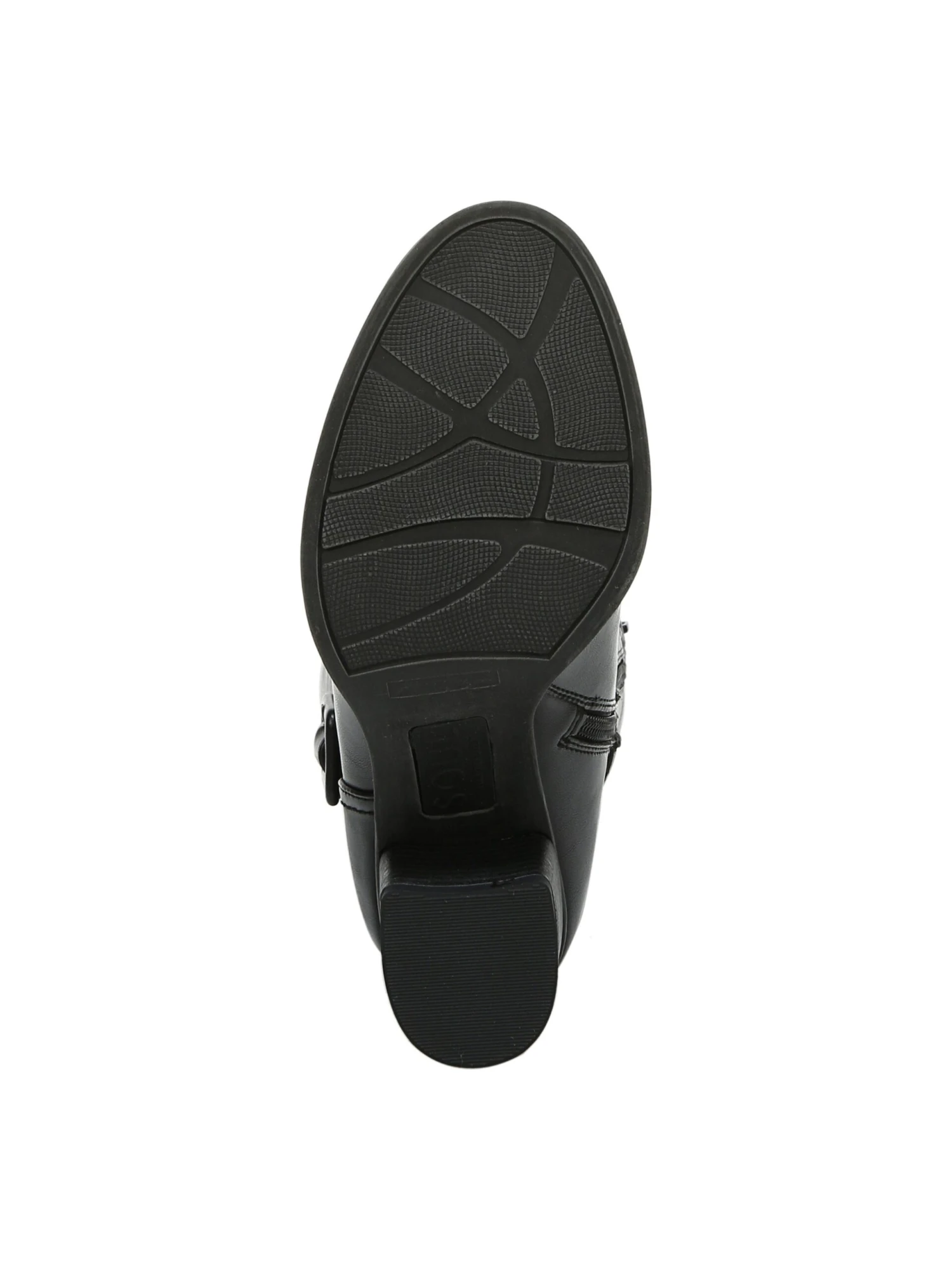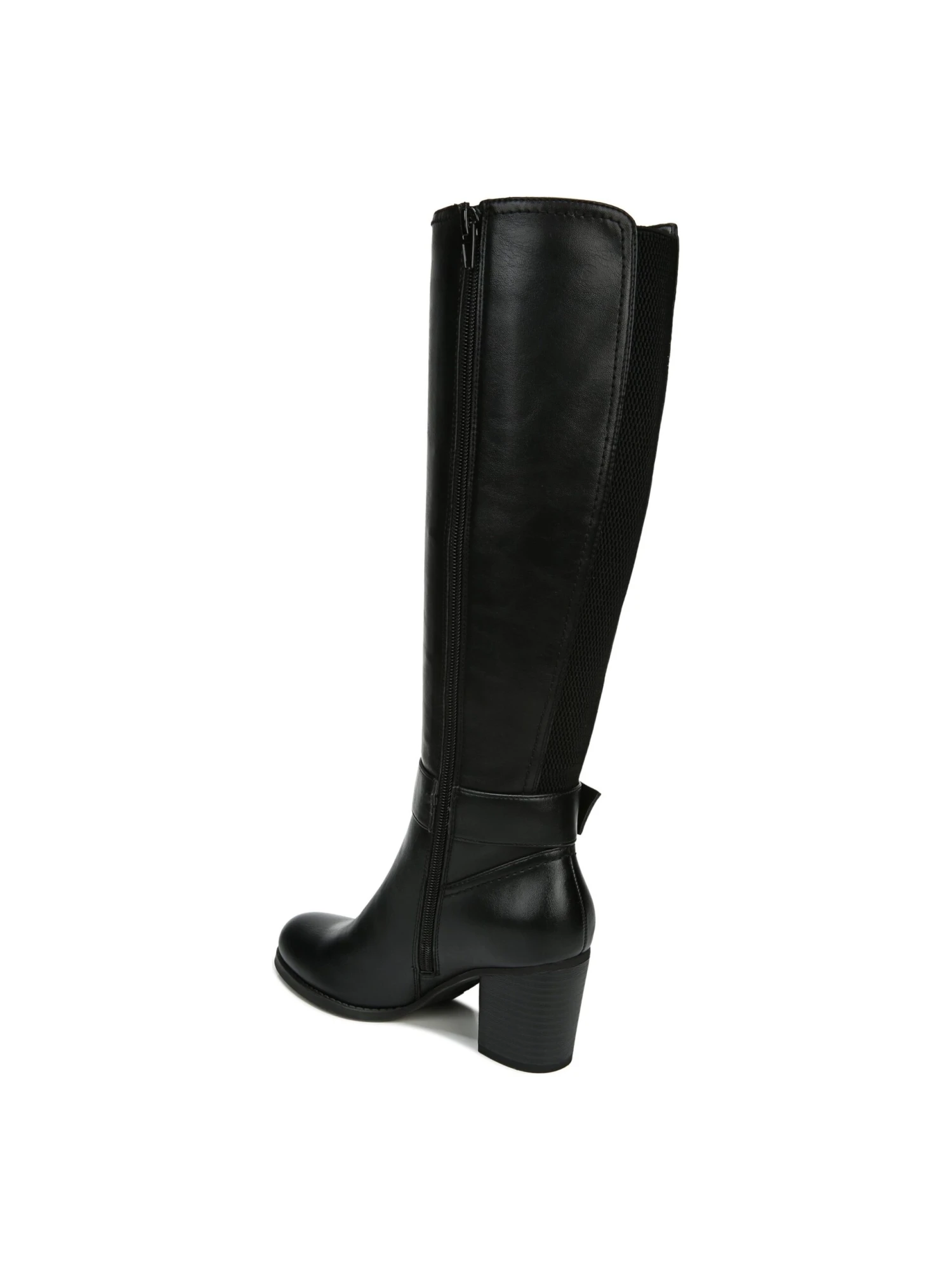 - Faux-leather upper in a knee-high, block-heel boot style with a round toe