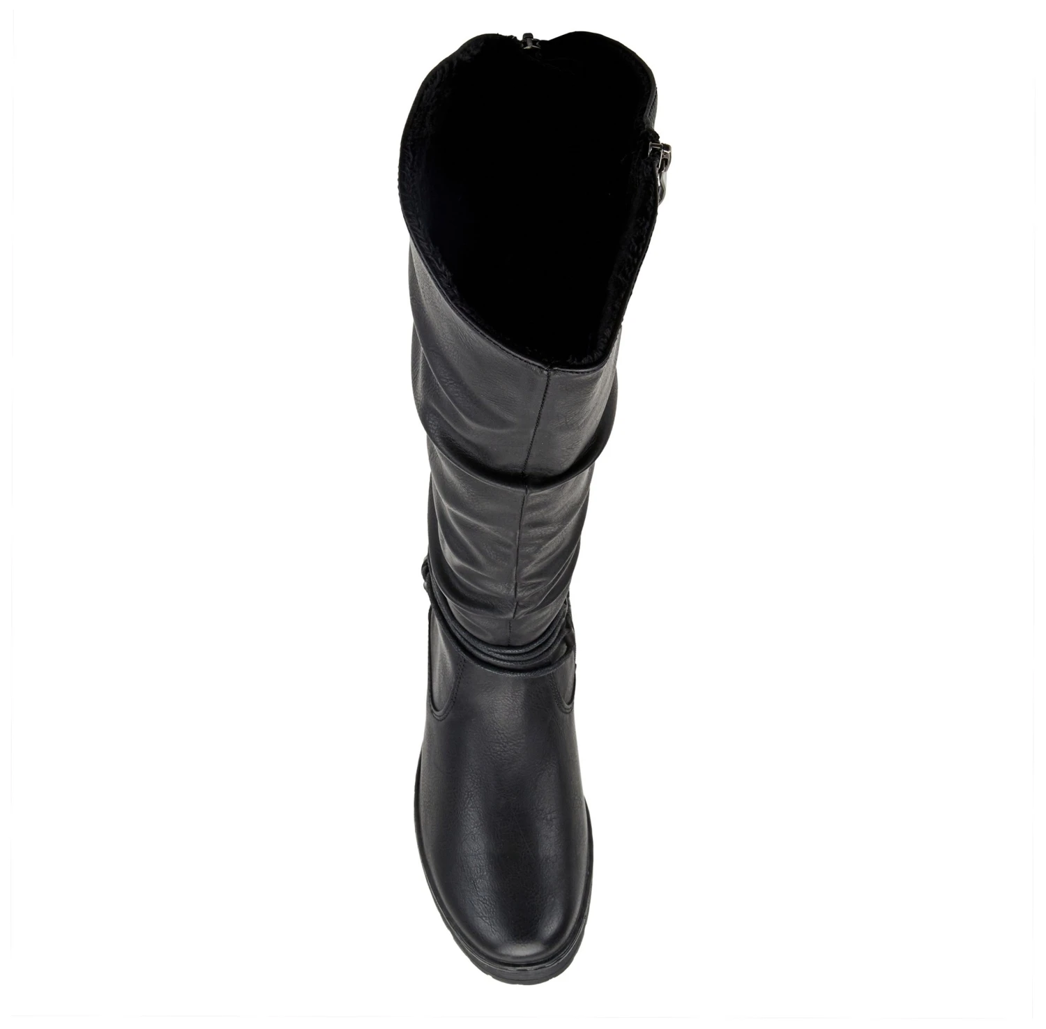 - Faux-leather upper in a water-resistant slouchy boot style with a round toe
