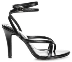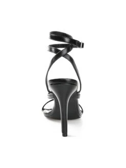 - Vegan leather upper in a stiletto heel style with an open toe.