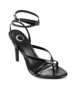 - Vegan leather upper in a stiletto heel style with an open toe.