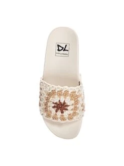 - Fabric upper in a slide sandal style with a round toe