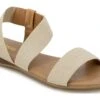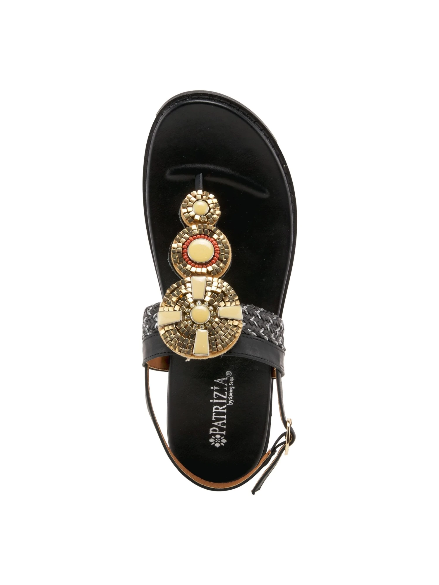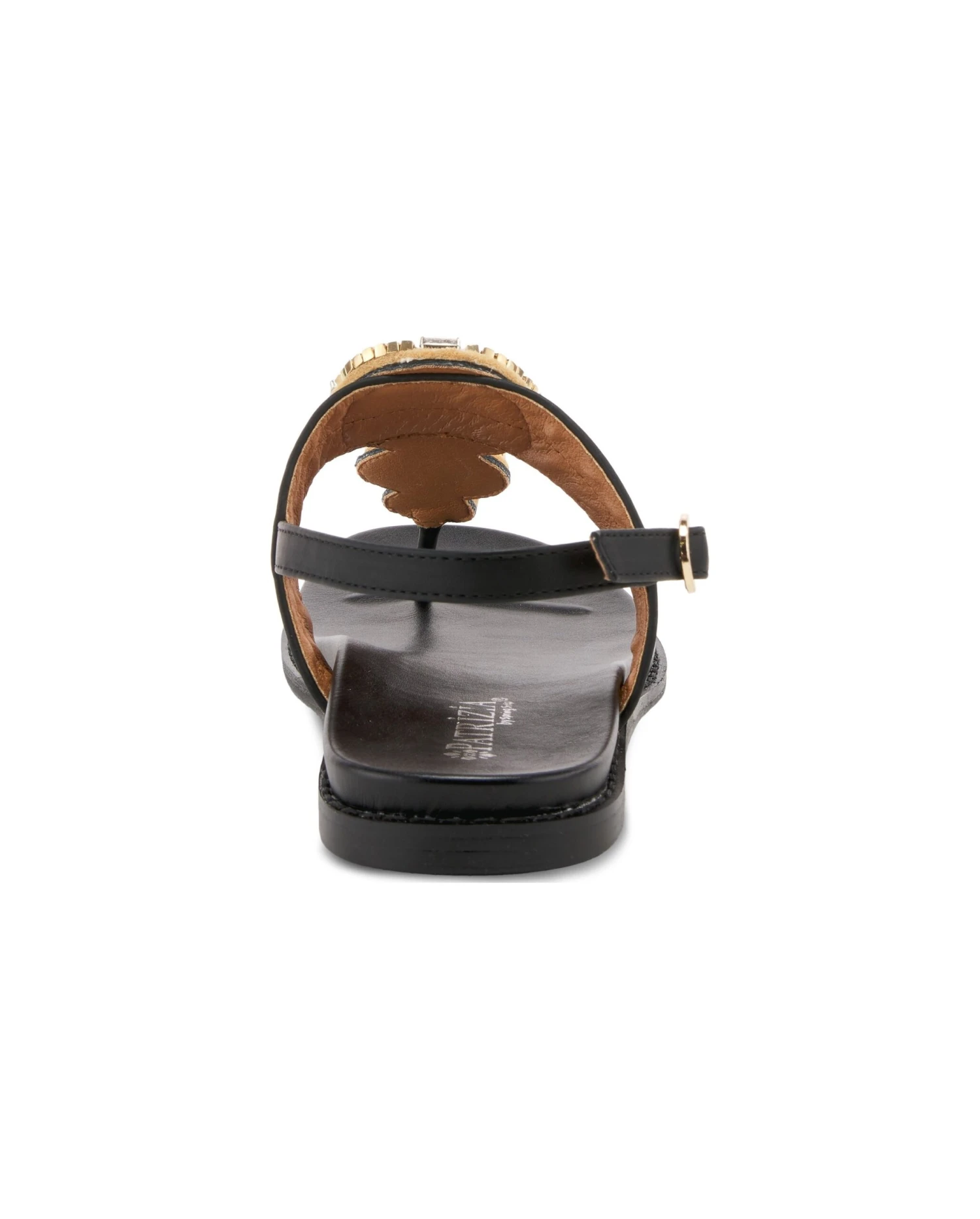 - Synthetic leather upper in a flat sandal style with an open toe.